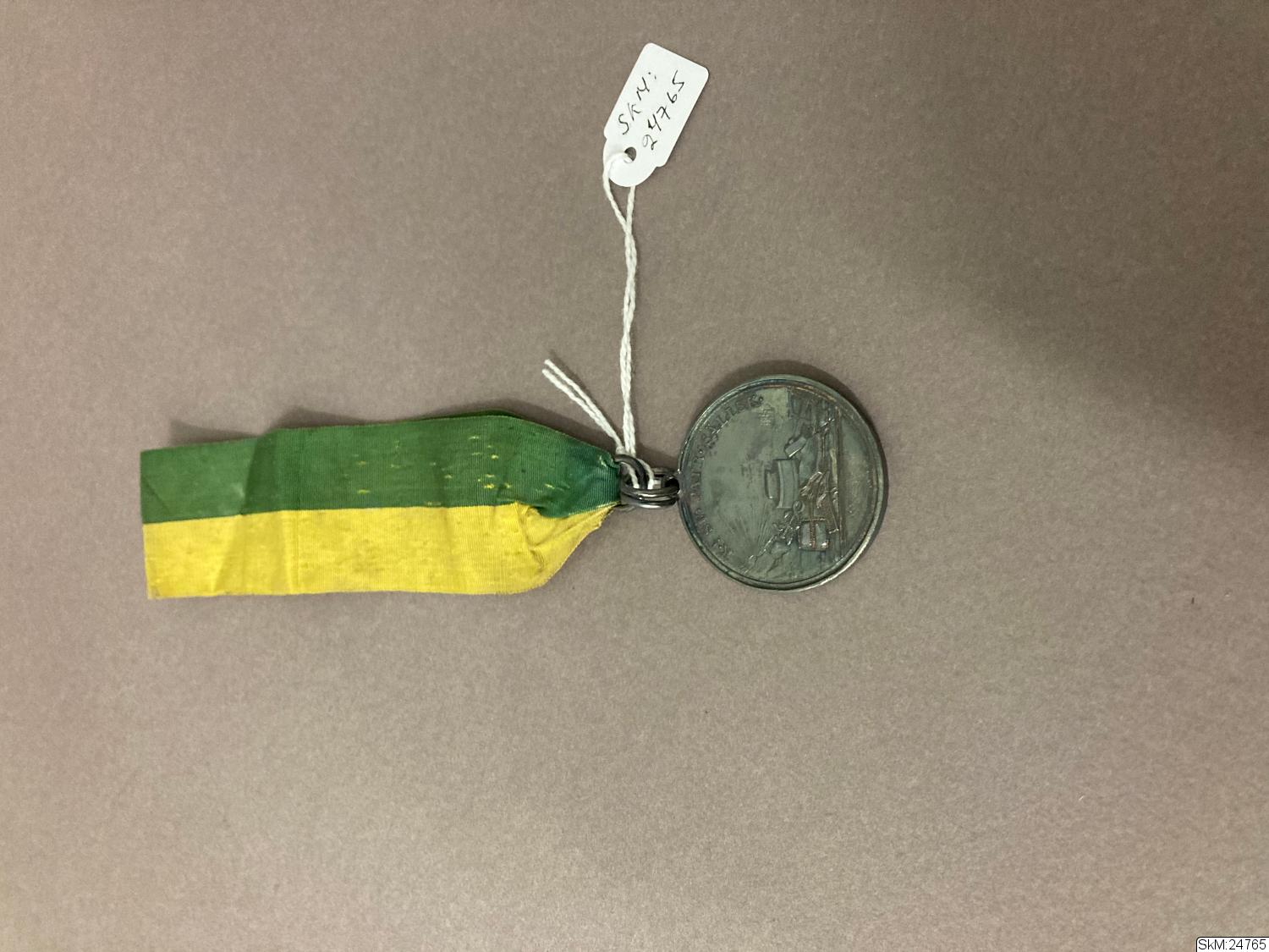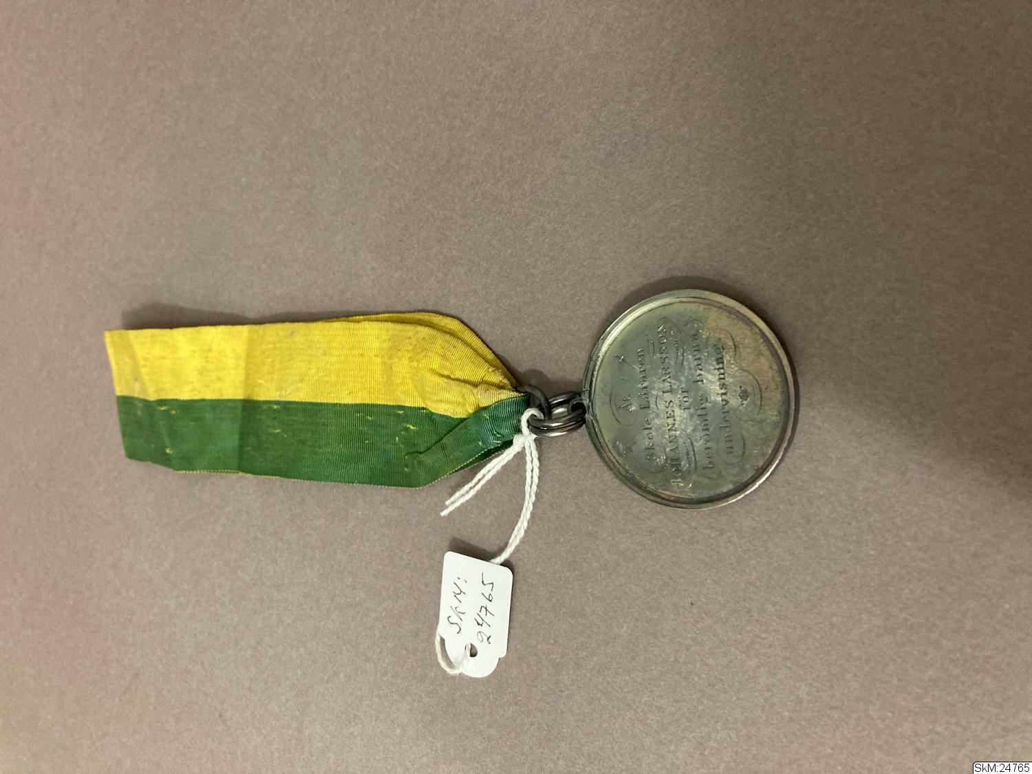 - silvermedalj, i sidenmoiréband tudelat gult-grönt, från Kungl. Patriotiska Sällskapet. Sällskapets sinnebilder samt texten Kl. Sv. Patr. Sällsk. (Kungliga svenska Patriotiska Sällskapet) pryder åtsidan samt inskription med mottagarens namn och förtjänstens art (barnaundervisning) beskriven i handgravyr på den släta frånsidan./ctn.