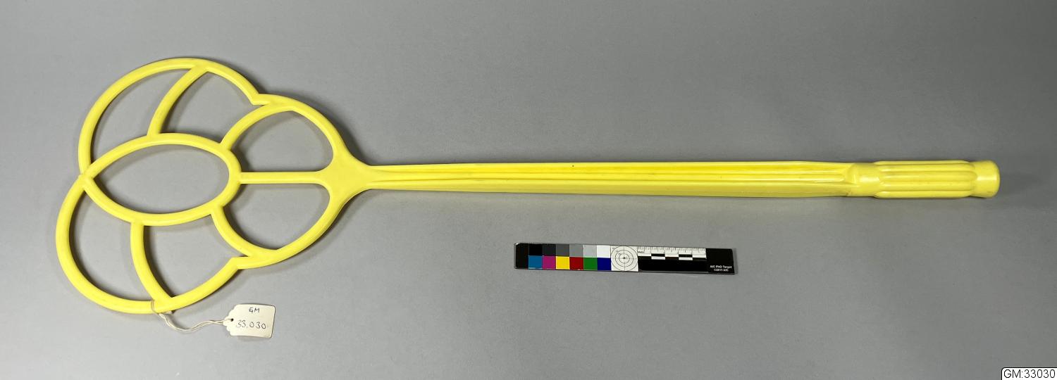 - Mattpiska i gul plast. Köpt på Göteborgs auktionsverk 1976.