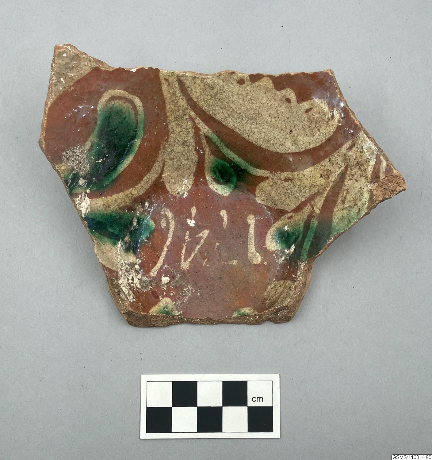Glaserat rödgods, fragment med gröna och gula dekorationer och årtalet 1746; Blyglasyr,piplerdekor; 1741i spegeln