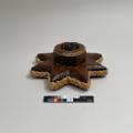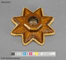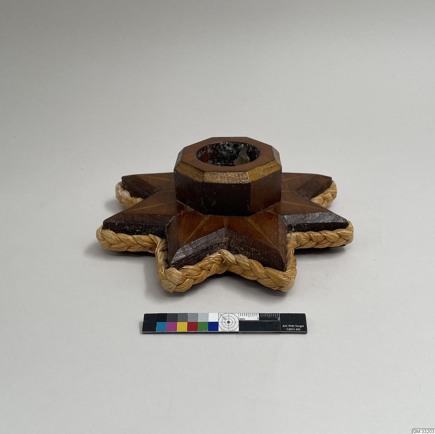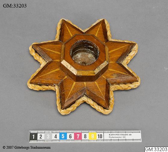 - Stjärnformad ljusstake av trä och halm. Julprydnad. Gåva från Sven Thiberg 1976.