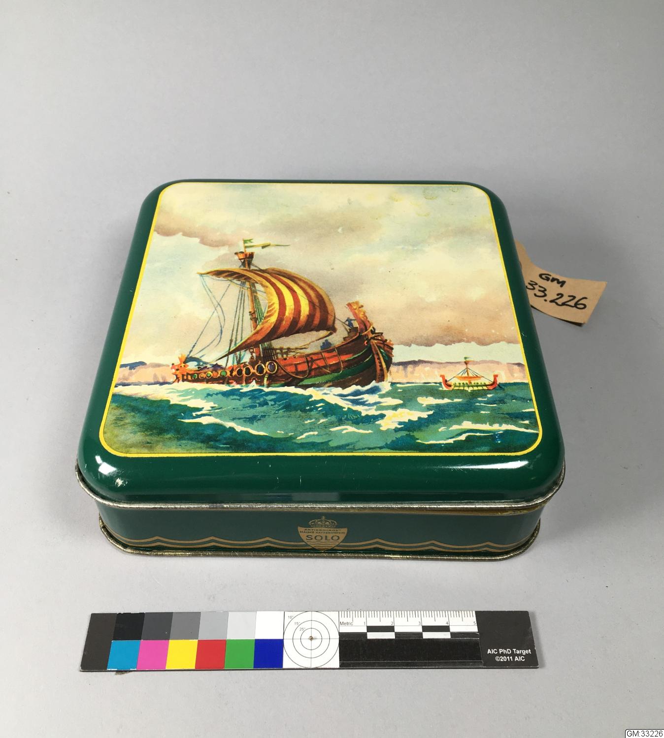 Kvadratisk burk med avrundade hörn. Tryck på locket: Vikingaskepp. Har innehållit "SOLO KAFFE". Malmö Kaffekompani.
