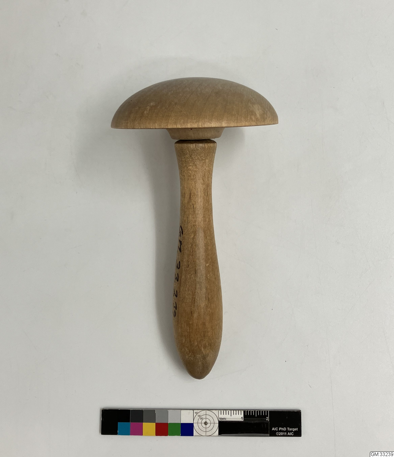 Svampformat träföremål - stoppsvamp - med halvklotformad "hatt" att dra strumpan över, då den stoppas. Svarvat profilerat skaft.