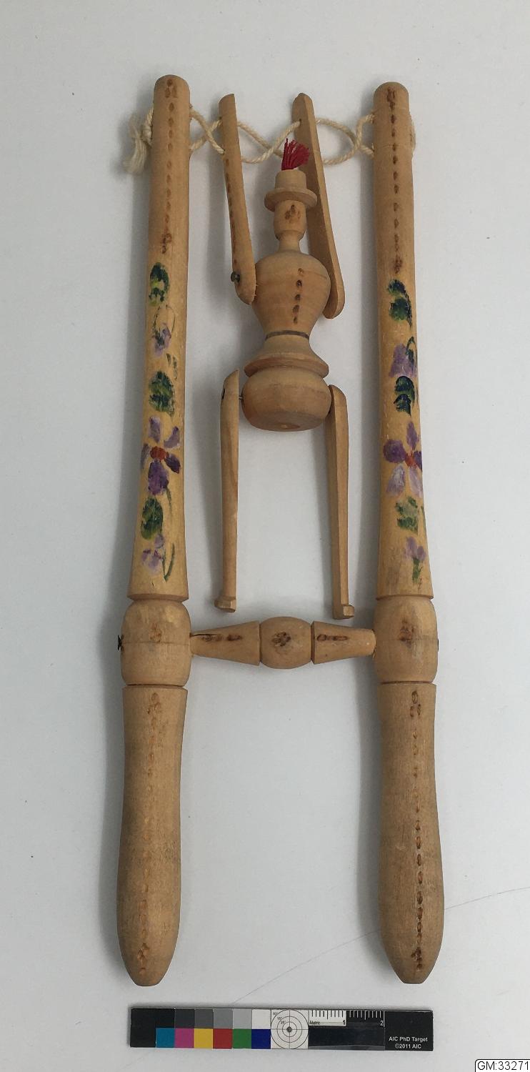 - Sprattelgubbe. Stiliserad ledad träfigur uppträdd på korsade snören mellan två trälyktor med tvärslå. Snöret kan spännas varvid figuren gör volter. Glödritningsdekor samt målad blomdekor i lila och grönt.