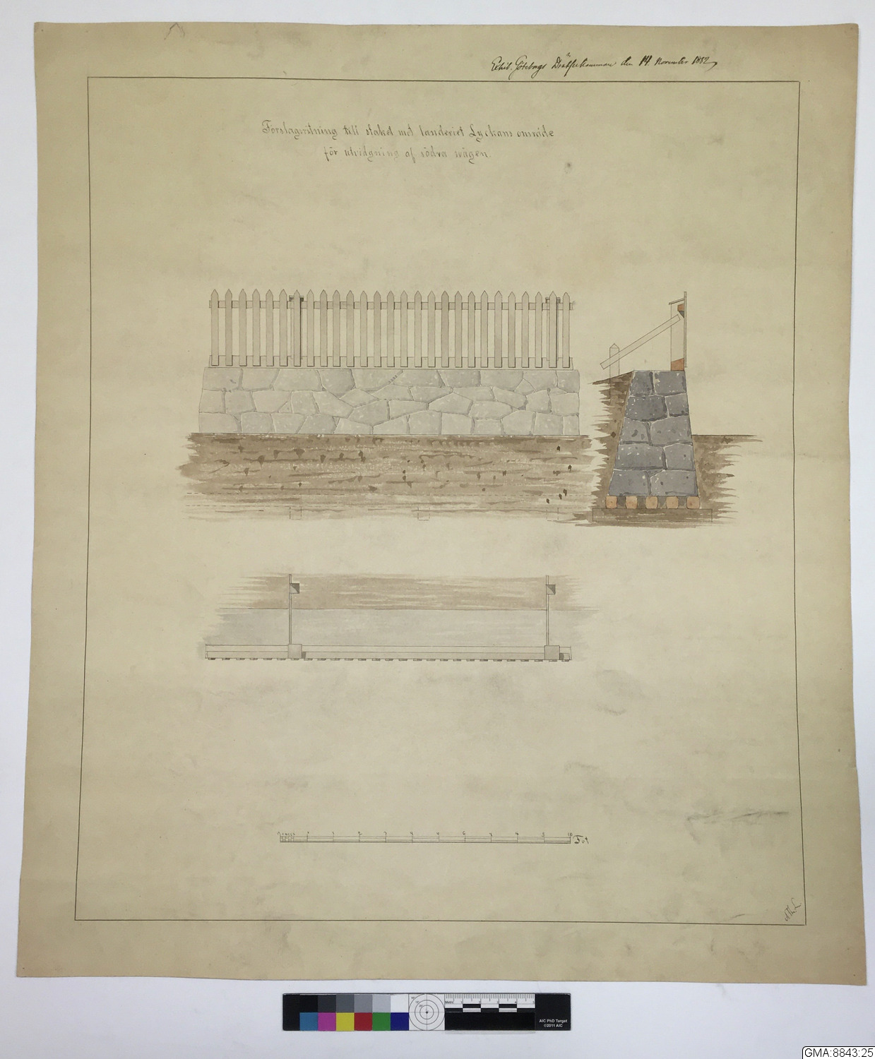 Ritning, "Förslagsritning till staket vid landeriet Lyckans område för utvidgning af södra wägen"