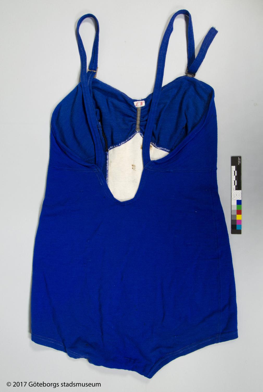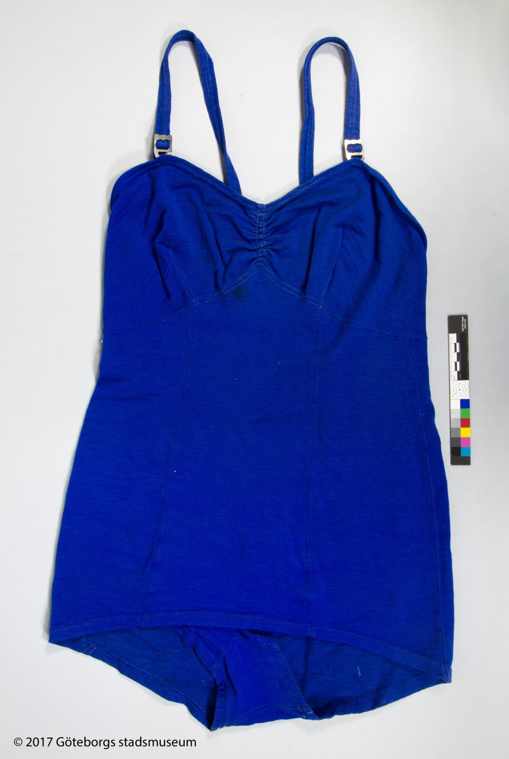 - Från katalogkort: Baddräkt, dam. Maskinstickad av blått ullgarn. Urringad i ryggen med axelband fastsydda på ringningen baktill och hällor på framsidan av denna att trä knytband genom.