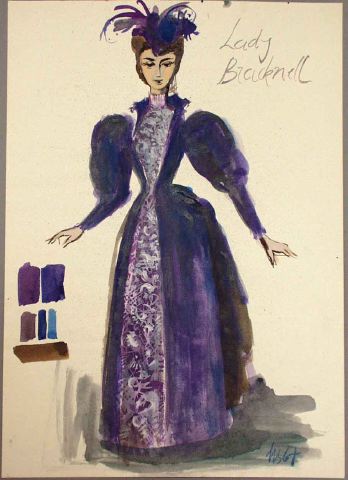 - Kvinna med mörkbrunt uppsatt hår är iklädd liten blålila hatt med fjädrar, hellång blålila klänning med fårbogsärmar, öppet sprund framtill som avslutas med en liten ståkrage vid halsen, i sprundet en höghalsad isättning i grålila mönster och som är fotsid. T v målade färgförslag.