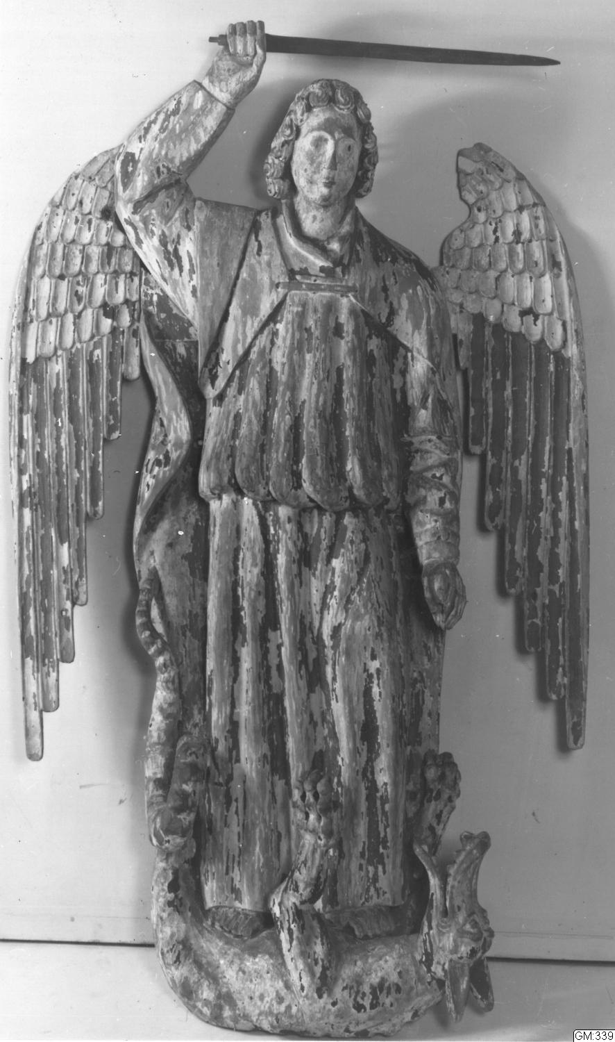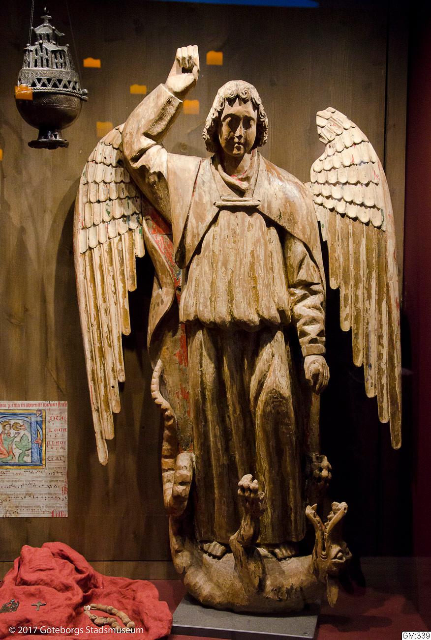 - Helgonbild St.Mikael snidad i trä (svärdet är nytt) Med spår av målning i rött, brunt och guld. Höjd 143. 1400-talets slut.