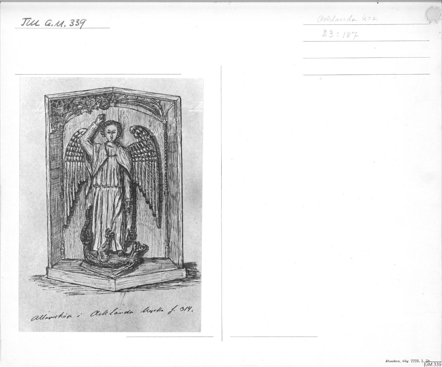 - Brusewitz kat nr 1351. Brusewitz i Göteb. mus 25-årsberättelse (1888) s. 109. Möjligen ur ett altarskåp. obs oda koncept till brev från Brusewitz till Riksantikvarien (Brusew. brevsaml) rörande föremål, s ämnar söka förvärva i Asklanda till Göteborgs museum "möjligen (ämnar jag begära) äfven ett altarskåp med bild af samma Erkeängel. (Tidigare har Mikaels-bilden från 1200-talet i samma kyrka varit på tal) Kan dock hända att jag ej bär detta fram (ehuru bilden der är bättre än den förra) emedan sjelfva skåpet kommer att taga sig nog skräpigt ut i vårt museum"