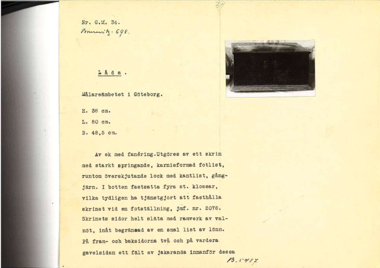 "Låda, Målareämbetet i Göteborg. Av ek med fanéring. Utgöres av ett skrin med starkt springande, karnisformad fotlist, runtom överskjutande lock med kantlist, gångjärn. I botten fastsatta fyra st. klossar, vilka tydligen ha tjänstgjort att fasthålla skrinet vid en fotställning, jmr. nr 2078. Skrinets sidor helt släta med ramverk av valnöt, inåt begränsad av en smal list av lönn. På fram- och baksidorna två och på vardera gavelsidan ett fält av jakaranda innanför dessa ramverk. Locket är fanérat på liknande sätt och innehåller ett fält. Lockets kantlist av björk, fotlisten masurbjörk. På framsidan två nyckelskyltar av mässing, på kortsidorna smidda handtag av järn samt beslag av järn, båda ursprungligen målade.