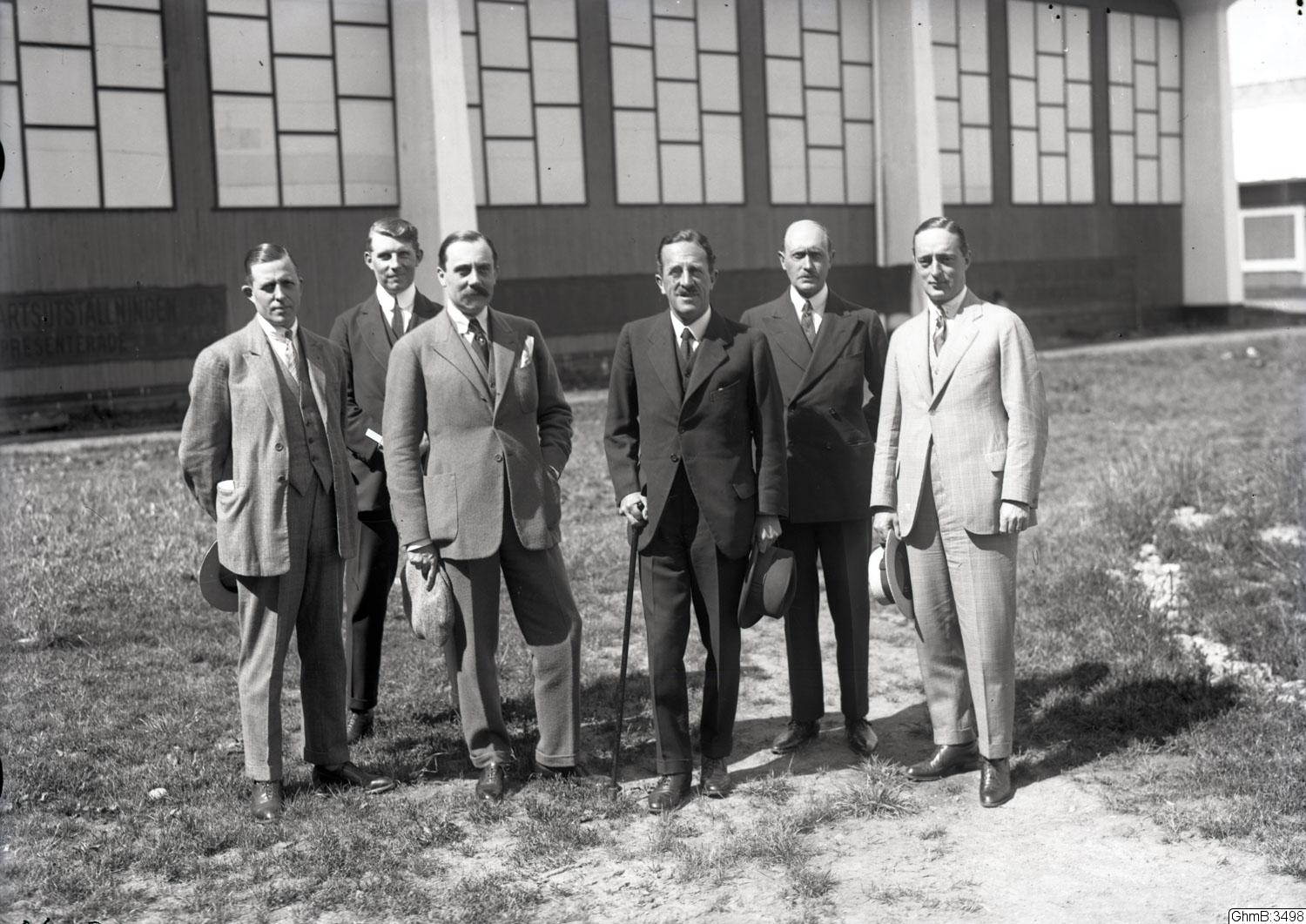"Kända personer å flyghamnen. Herr Hugo Lundqvist, ingenjör G.V. Nordenswan, monsieur André Granet, general Sir Sefton Brancker, kapten Y. Tellander, löjtnant C. Florman"