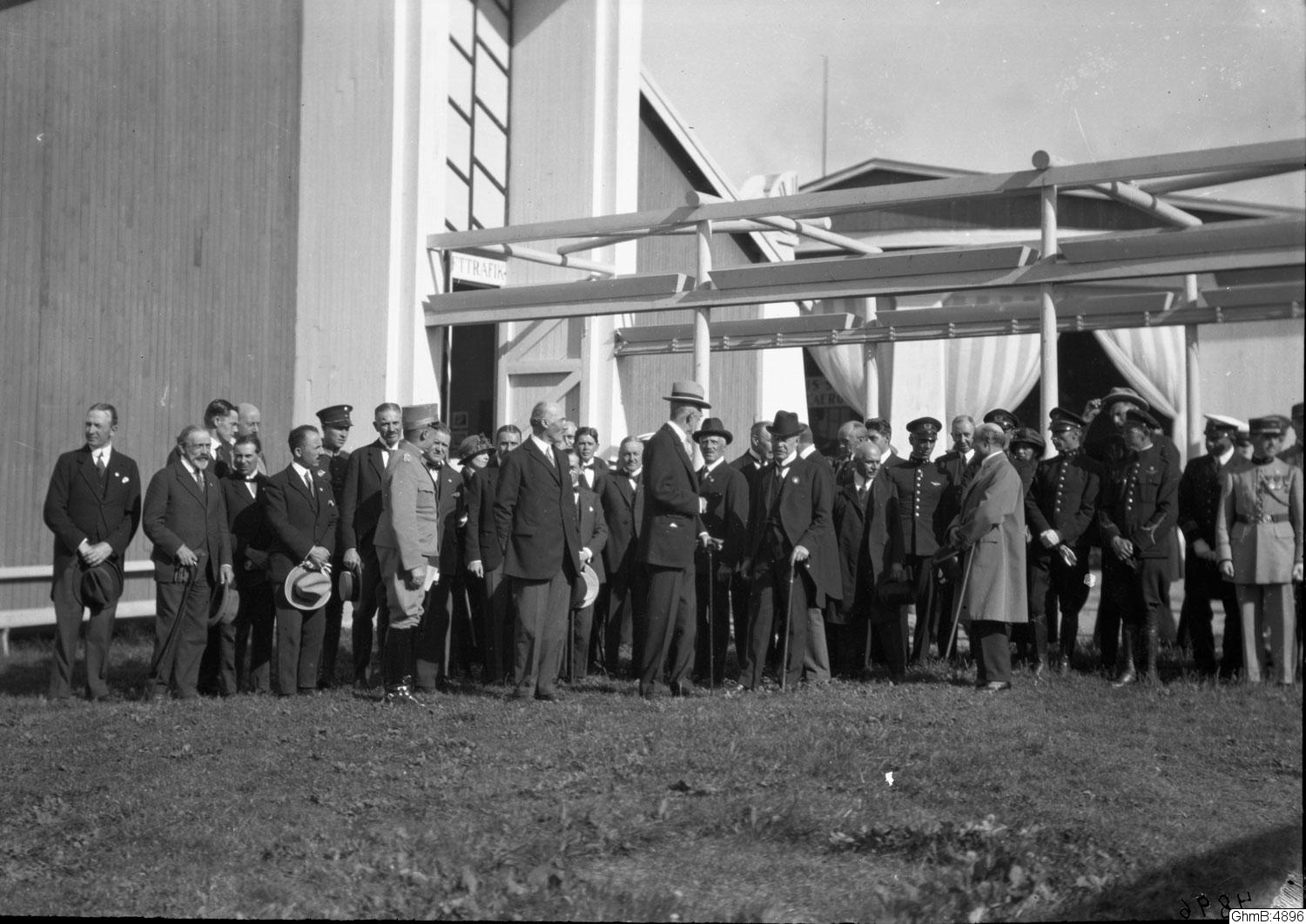 "Internationella luftfartsutställningen i Göteborg 1923, 20 juli-12 aug. Hans Maj:t Konungen besöker Ilug, Konungen och F. A. I:s kongressdelegater"