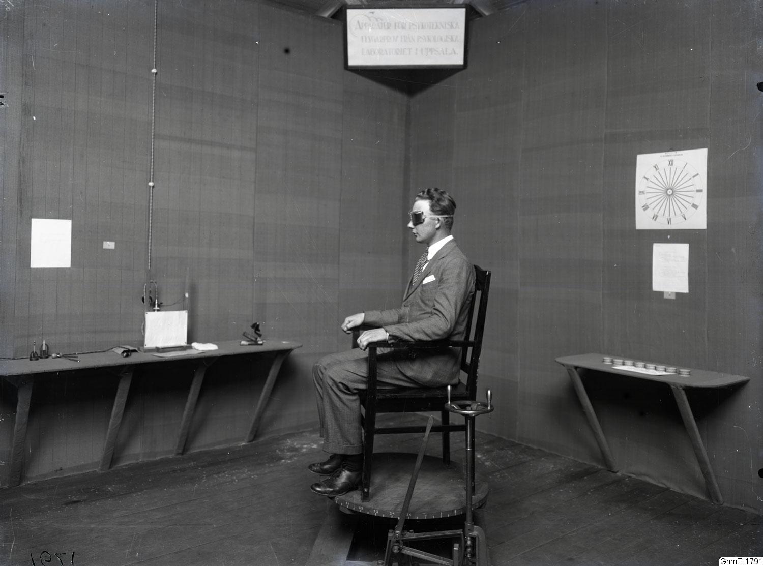 "Internationella Luftfartsutställningen i Göteborg 1923, 20 juli-12 aug. Interiörer från vetenskapliga avdelningen" Apparater för psykotekniska flygarprov från psykologiska laboratoriet i Uppsala
