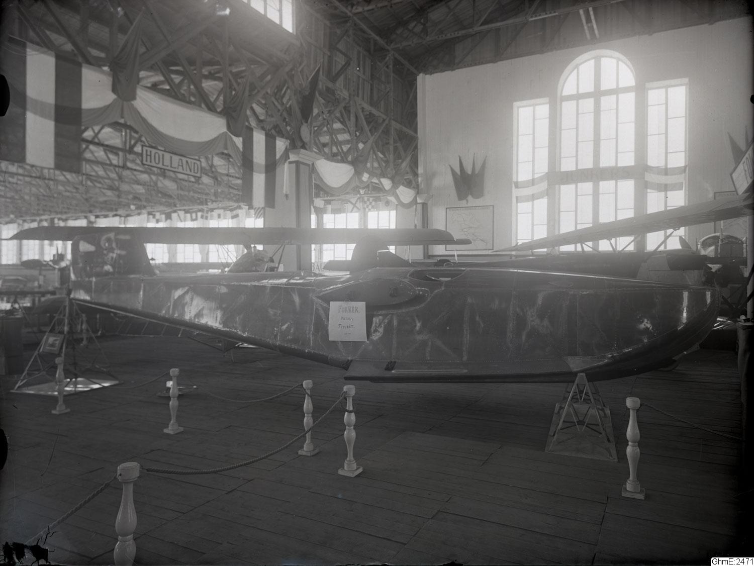"Internationella luftfartsutställningen i Göteborg 1923, 20 juli-12 aug. Interiörer av stora hallens olika montrar. Fokker"
