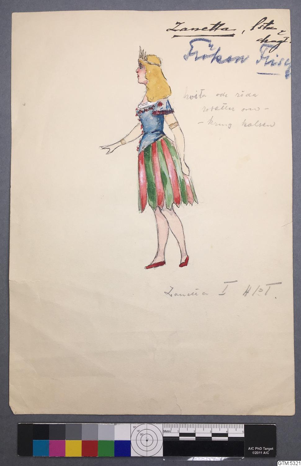 Kost. skiss Zanetta akt III av F. Eggerling efter vinjetter. Prinsessan av Trebizonde, Stora Teatern 1902.