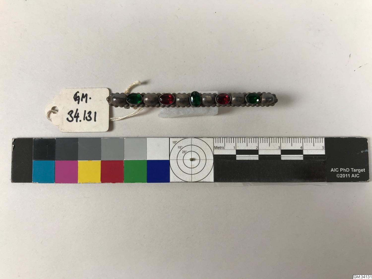 - långsmal brosch av vitmetall med 2 röda och tre gröna glasstenar