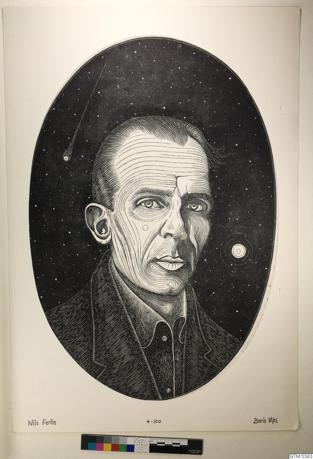 Träsnitt, Nils Ferlin av Boris Ahl, 4-100. Från utställning på Teaterhistoriska museet Göteborg, 1982.
