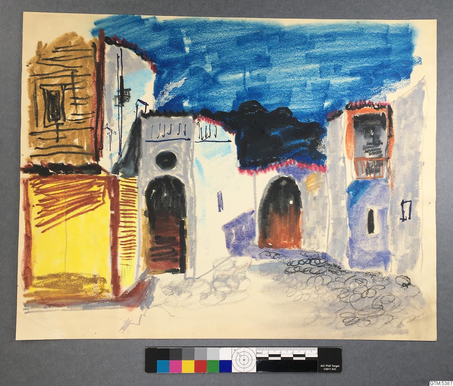 Handmålade scenbild till Ökensången på Stora Teatern, 1957