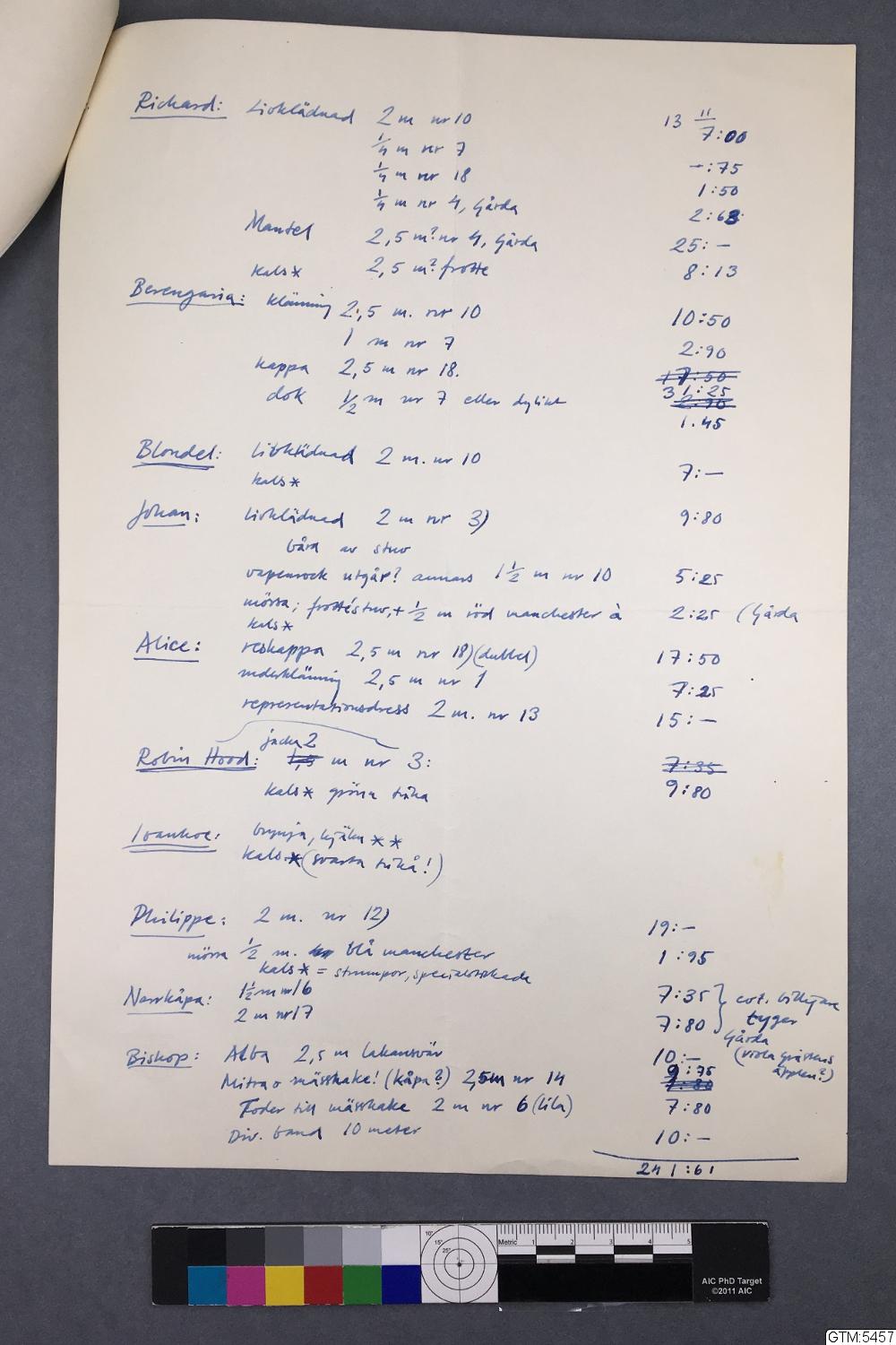 Häfte, 4 sidor med listor, kostnader, dagordning och tygbeställningar.