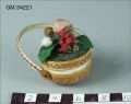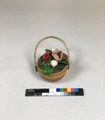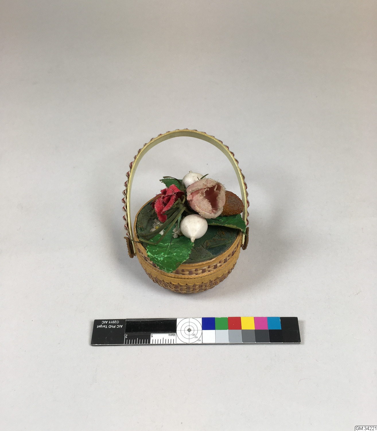 prydd med frukter av tyg m.m. :1 i form av korg med grepe, :2 lock av papp