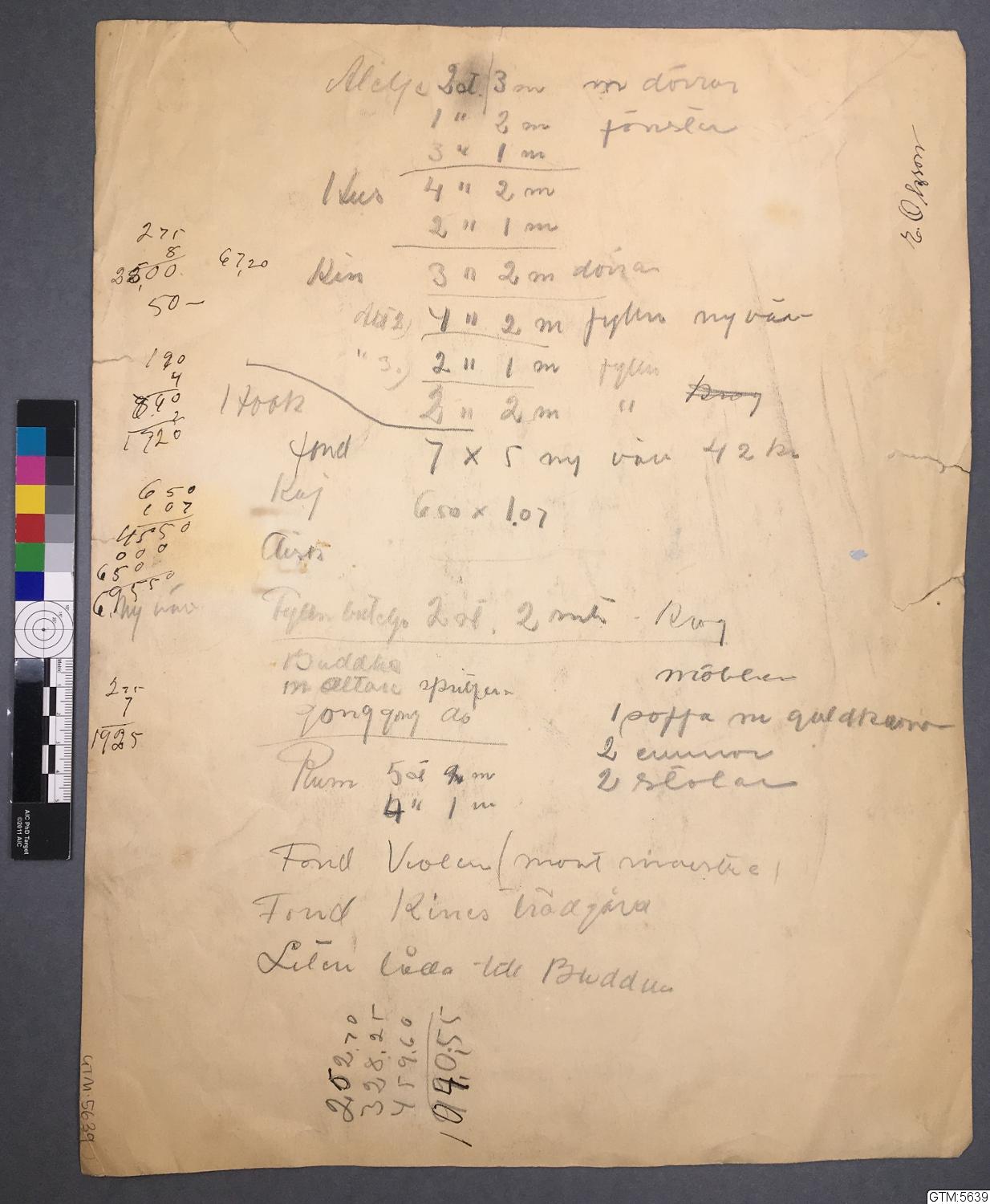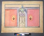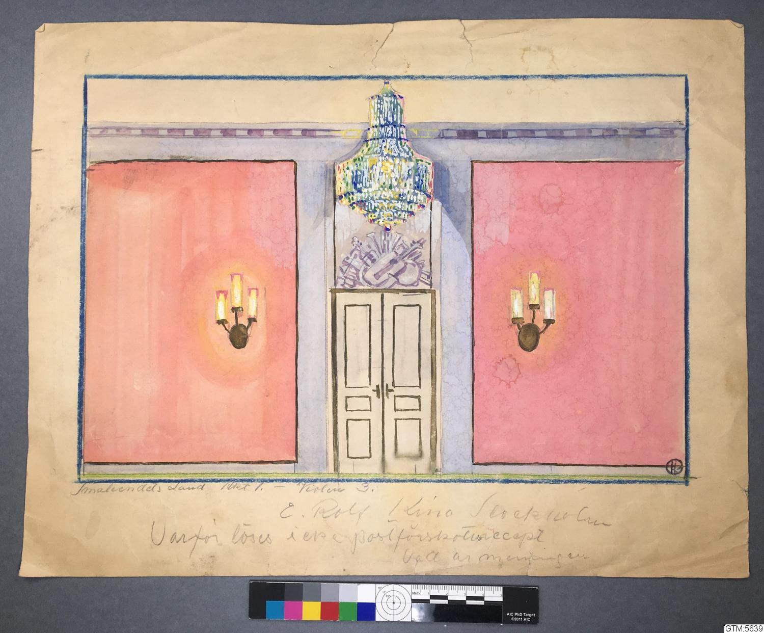 Skiss till scenkonst, rosa väggar med vita dörrar i mitten.