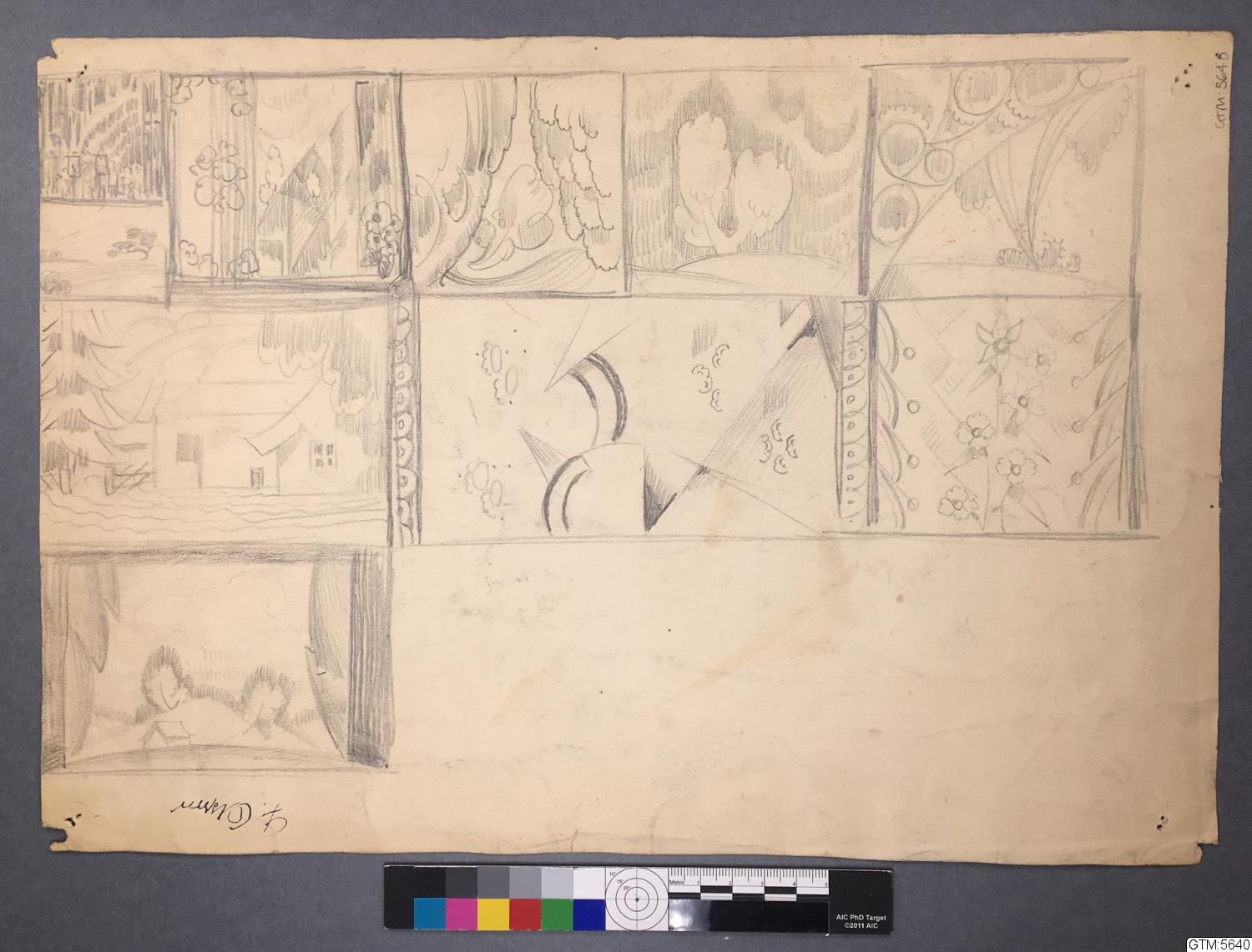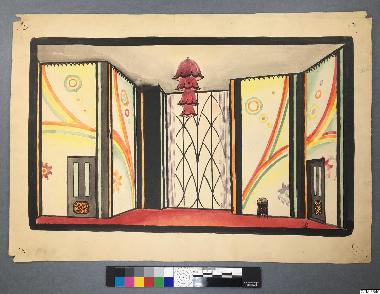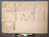 - Skiss till scenkonst, 20-tals rum med målade väggar, även serieteckning på baksidan