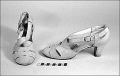 Ett par sandaletter av benvitt skinn. Framparti delvis genombrutet i rutmönster, öppna sidor. Knäpps med metallspänne, som sitter i korsade remmar, som utgår från framdelen och går runt hålpartiet genom tre skinnhällor. Lädersulor.