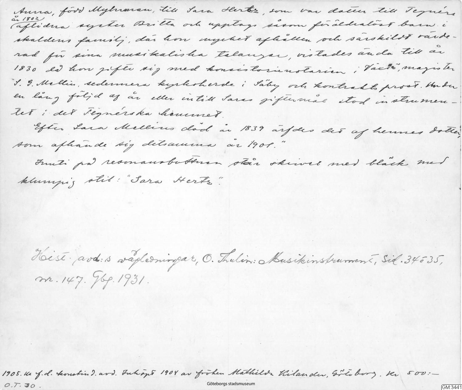 Efter Sara Mellins död år 1839 ärfdes det av hennes