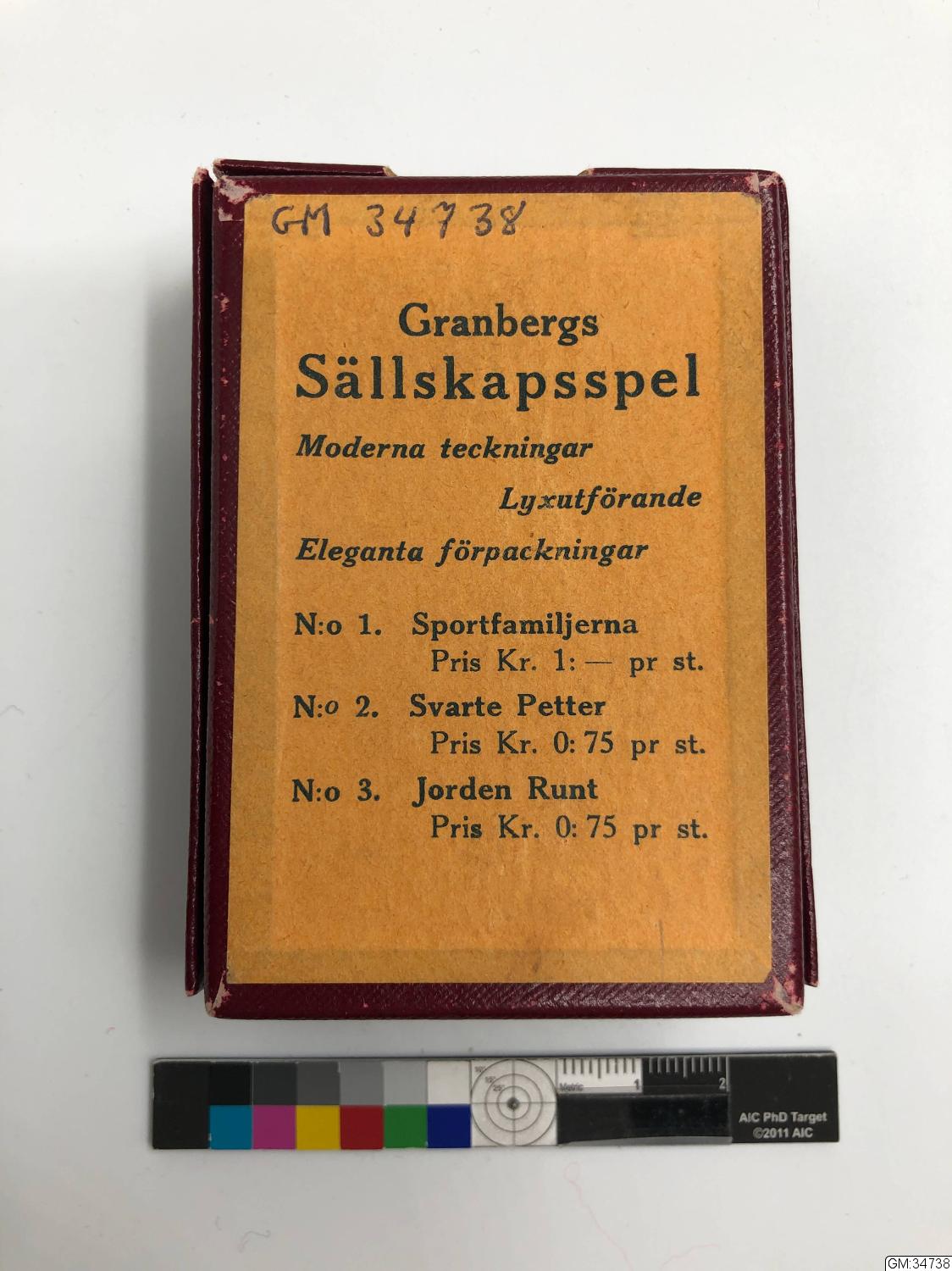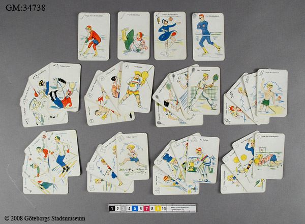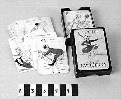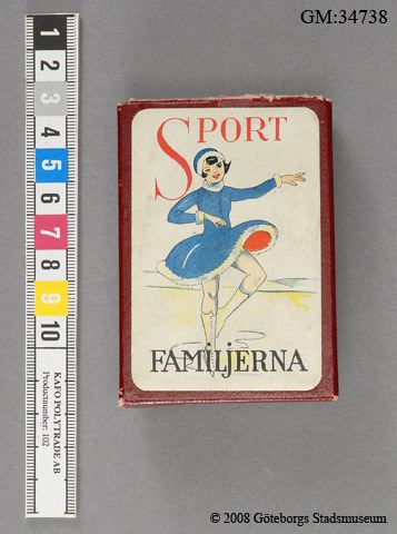 - kortlek innehållande 36 stycken spelkort i glättat papper i polykromt tryck "Fröken simmare", "Fröken fotbollspelare" etc. på ena sidan, dekorationstryck i brunt och rosa på den andra sidan. I ask klädd med vinröd klot och med titelbild: skridskoåkerska samt texten SPORTFAMILJERNA. På lockets insida är spelreglerna angivna. Ursprungligt pris: 1:-