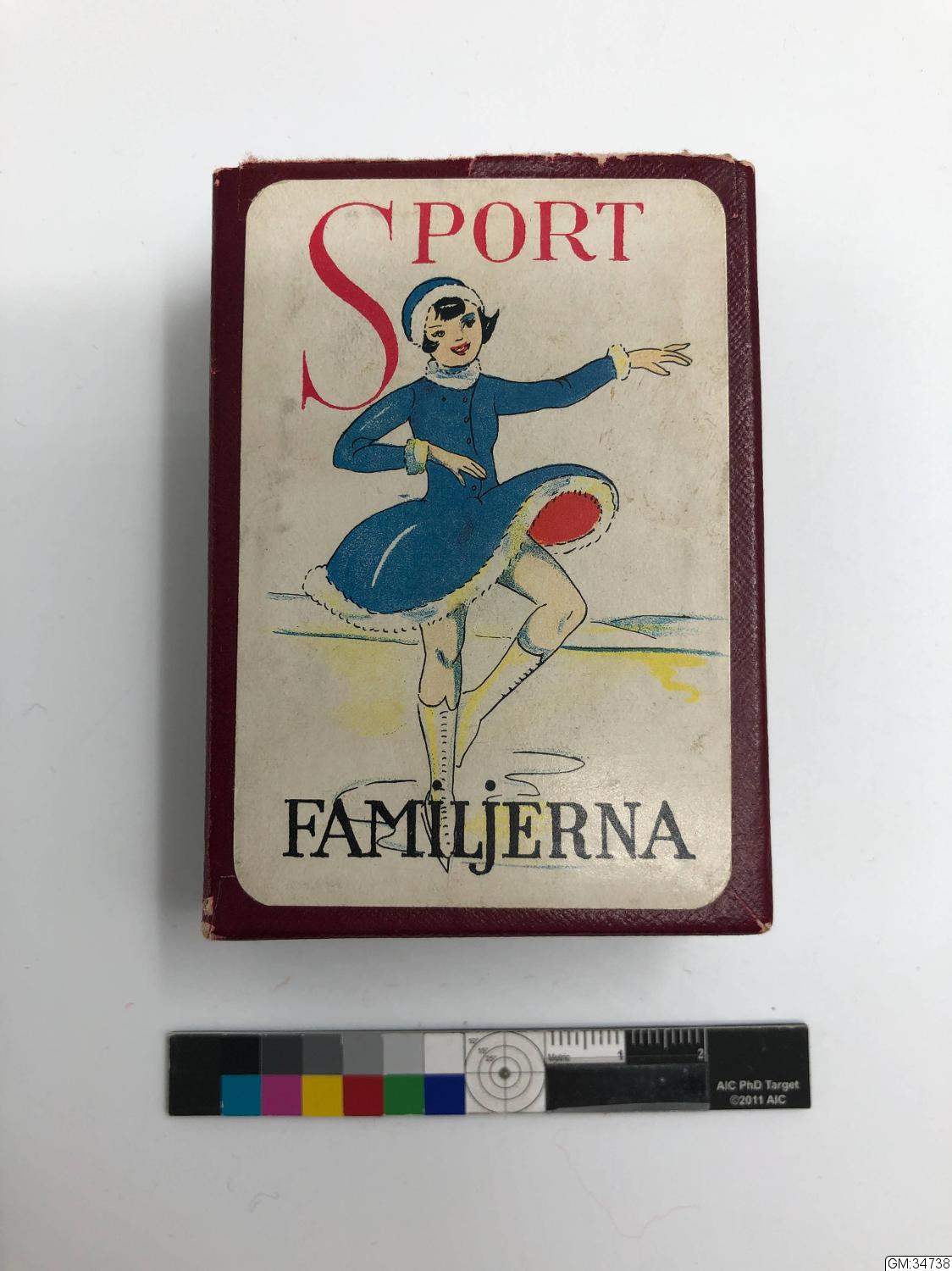 kortlek innehållande 36 stycken spelkort i glättat papper i polykromt tryck "Fröken simmare", "Fröken fotbollspelare" etc. på ena sidan, dekorationstryck i brunt och rosa på den andra sidan. I ask klädd med vinröd klot och med titelbild: skridskoåkerska samt texten SPORTFAMILJERNA. På lockets insida är spelreglerna angivna. Ursprungligt pris: 1:-