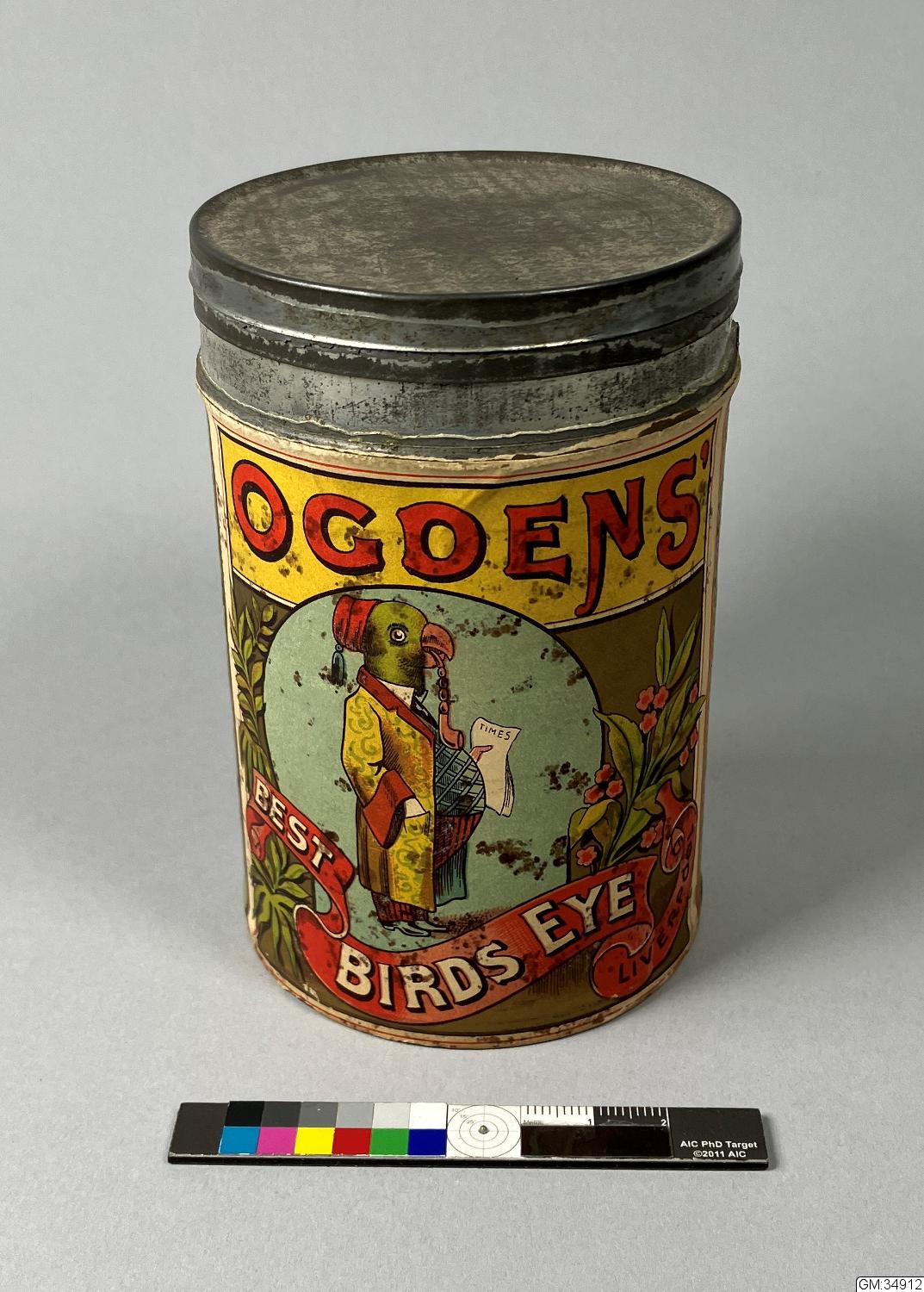 Cylindrisk plåtburk med lock. Har etikett med texten "Ogdens' Best Birds Eye, Liverpool".
