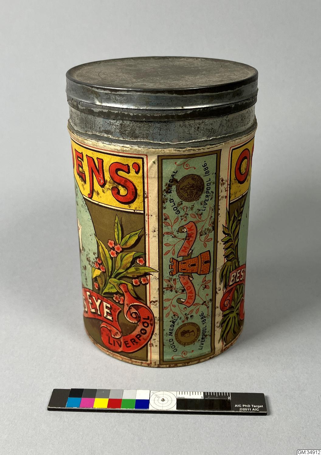 GM:34912 :: förvaring, burk, förpackning, plåtburk, tobaksburk