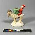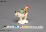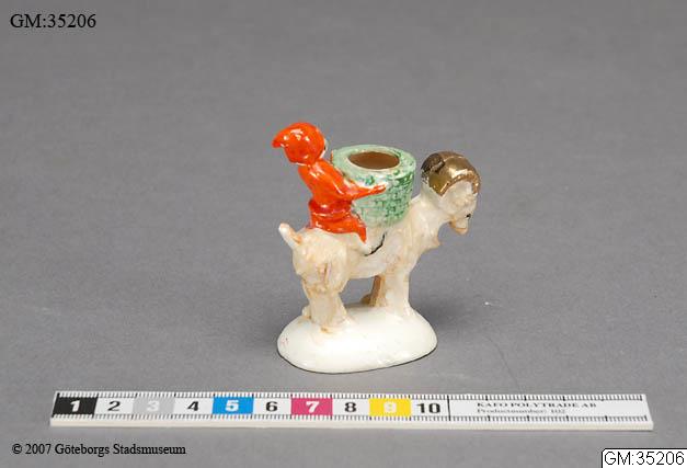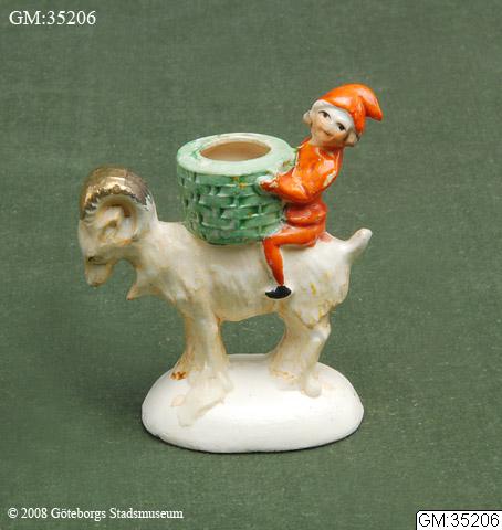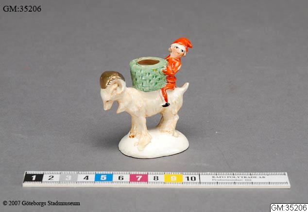 Ljusstake av porslin, med tomte på get. Tillverkad ca 1920. Gåva från Ingrid Hoppe 1977.