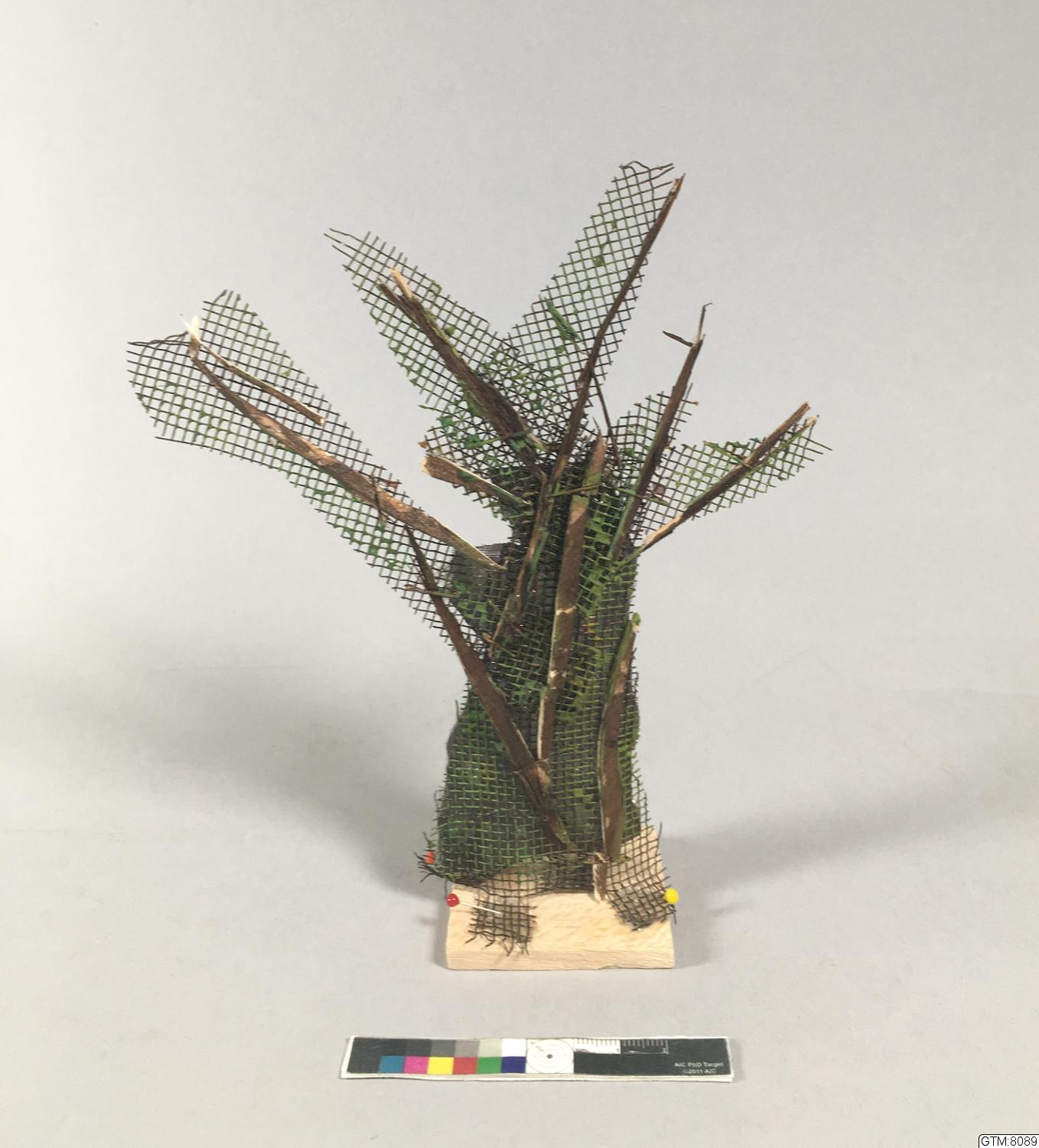 - Ett träd tillverkat av papper och metallnät bemålat grönt och brunt