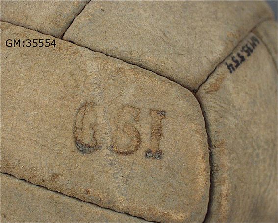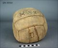 Fotboll av läder, grå sliten. Hopsydd av 18 bitar. Knyts med bomullsband. Märkt på flera ställen GSI. Gåva från Göteborgs fritidsförvaltning 1977.