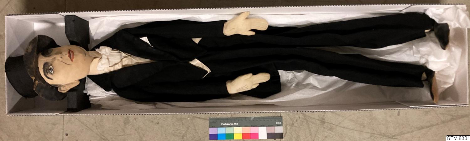 Manlig figur i frack och hög hatt. Dockan hålls upp av en käpp från huvudet och ner under dockans kläder.