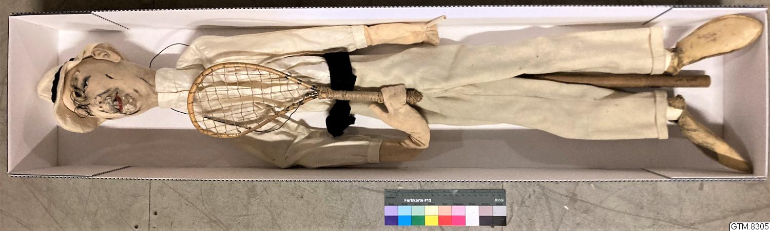 - Docka föreställande kung Gustav V. Dockan håller i ett tennisracket och en cigarett. Den har vita kavaj, byxor och sommarhatt. Dockan hålls upp av en käpp från huvudet och ner under dockans kläder.