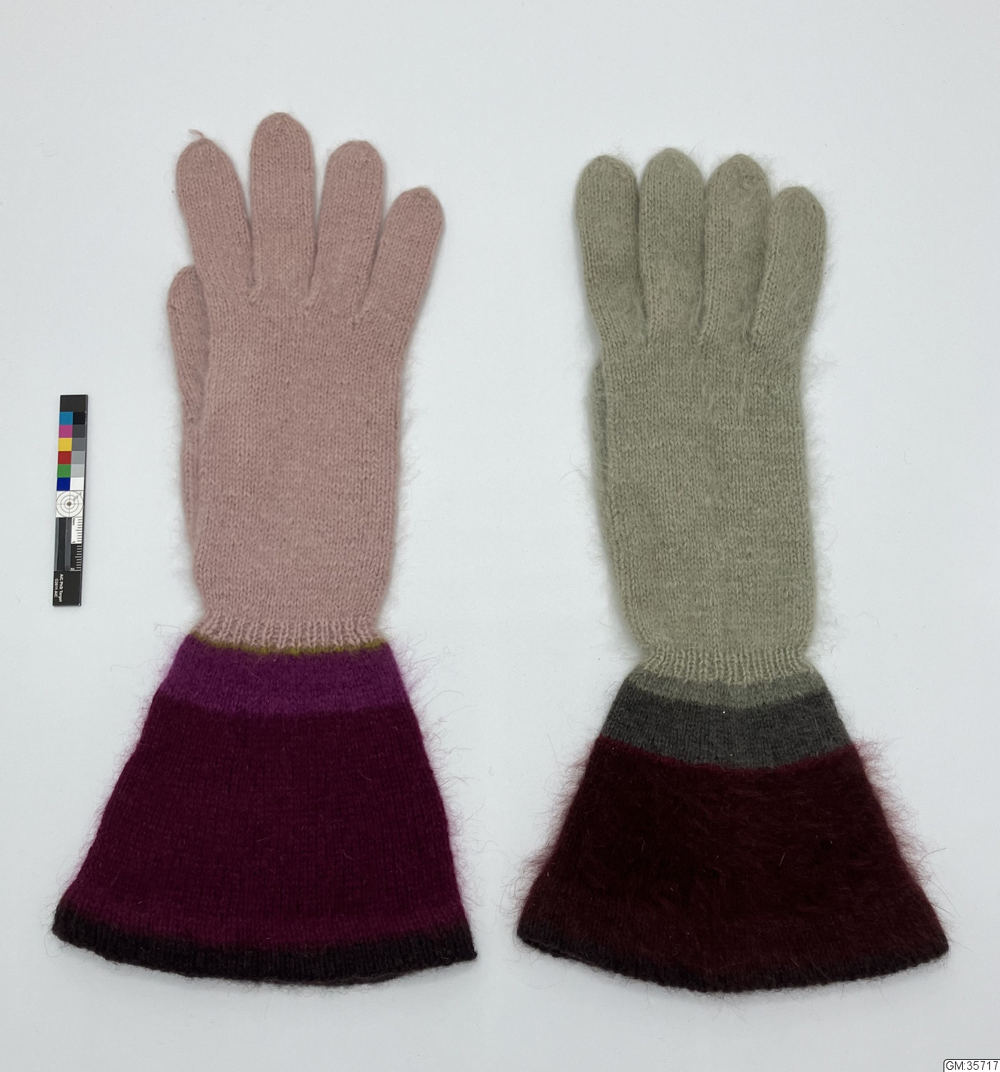 Två uppstickade fingervantar i olika färgvarianter från Bohus stickning.