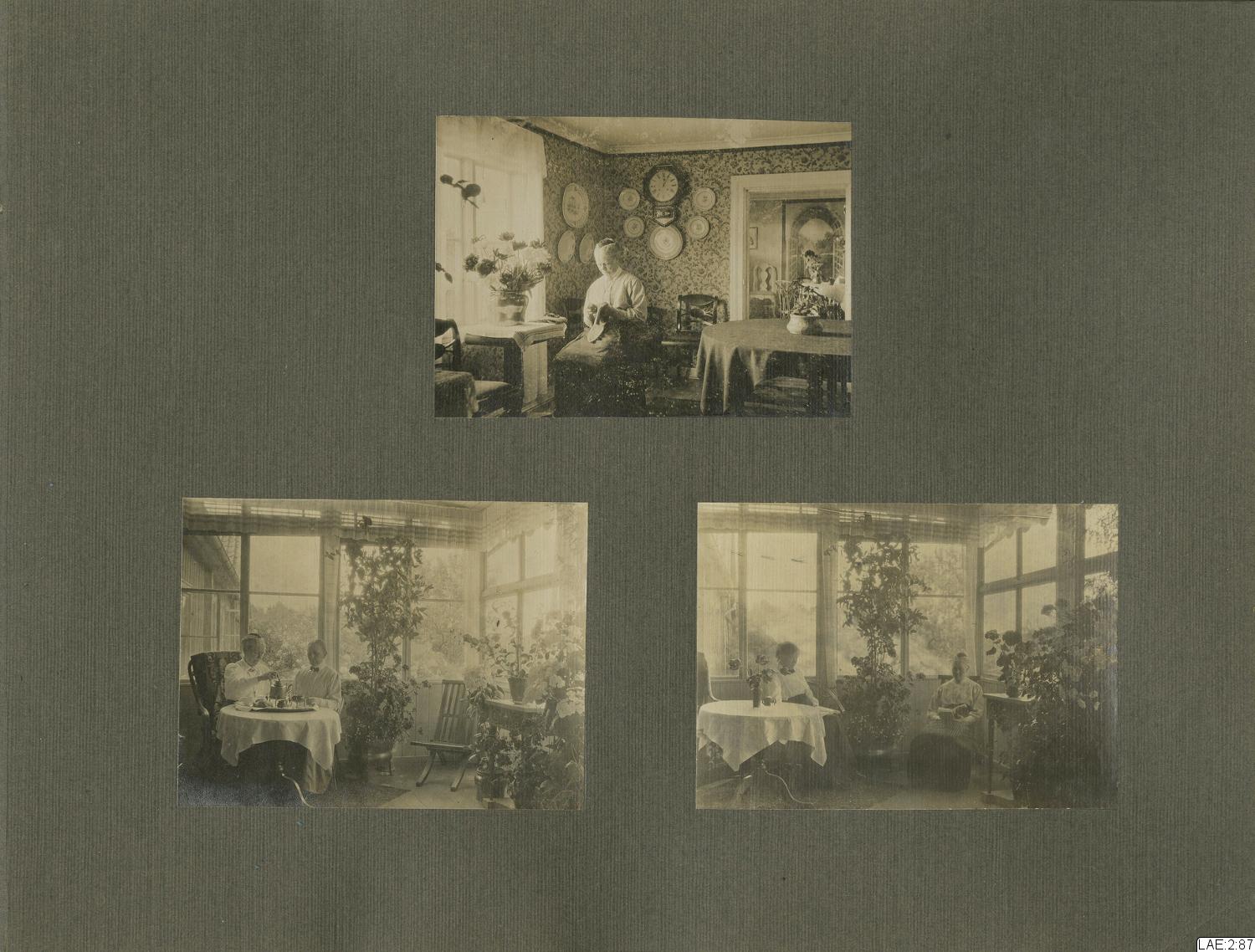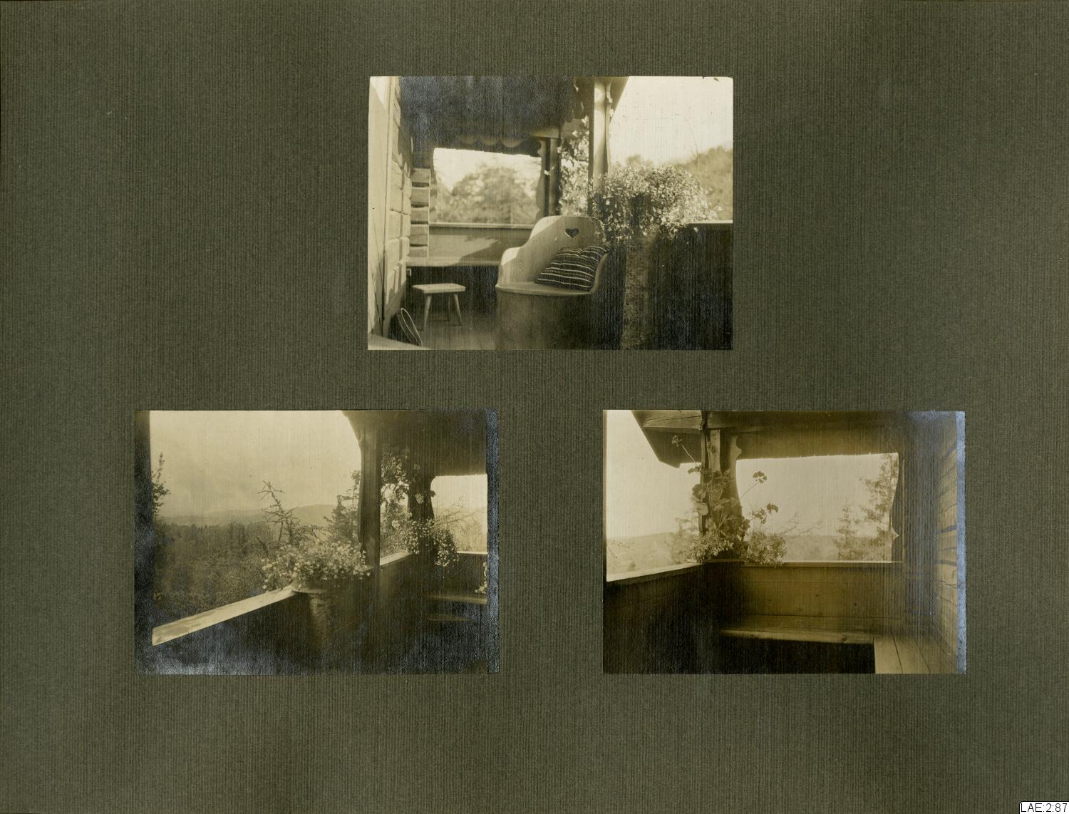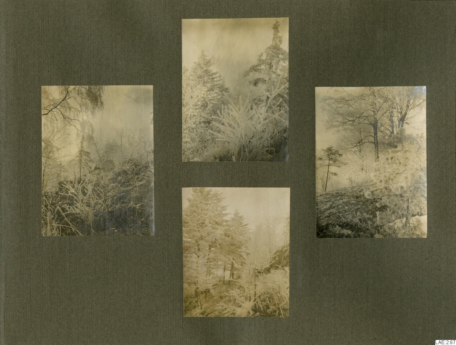 - Fotoalbum med skinnklädda, svarta pärmar, marmorerade speglar, och sidor i tjockare papper/tunn kartong med förgyllt snitt. De flesta av albumets sidor har pålimmade fotografier på ena sidan.
