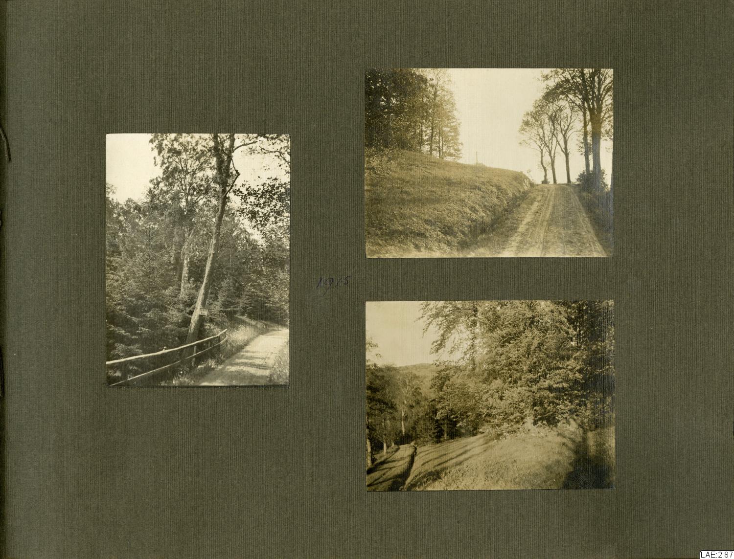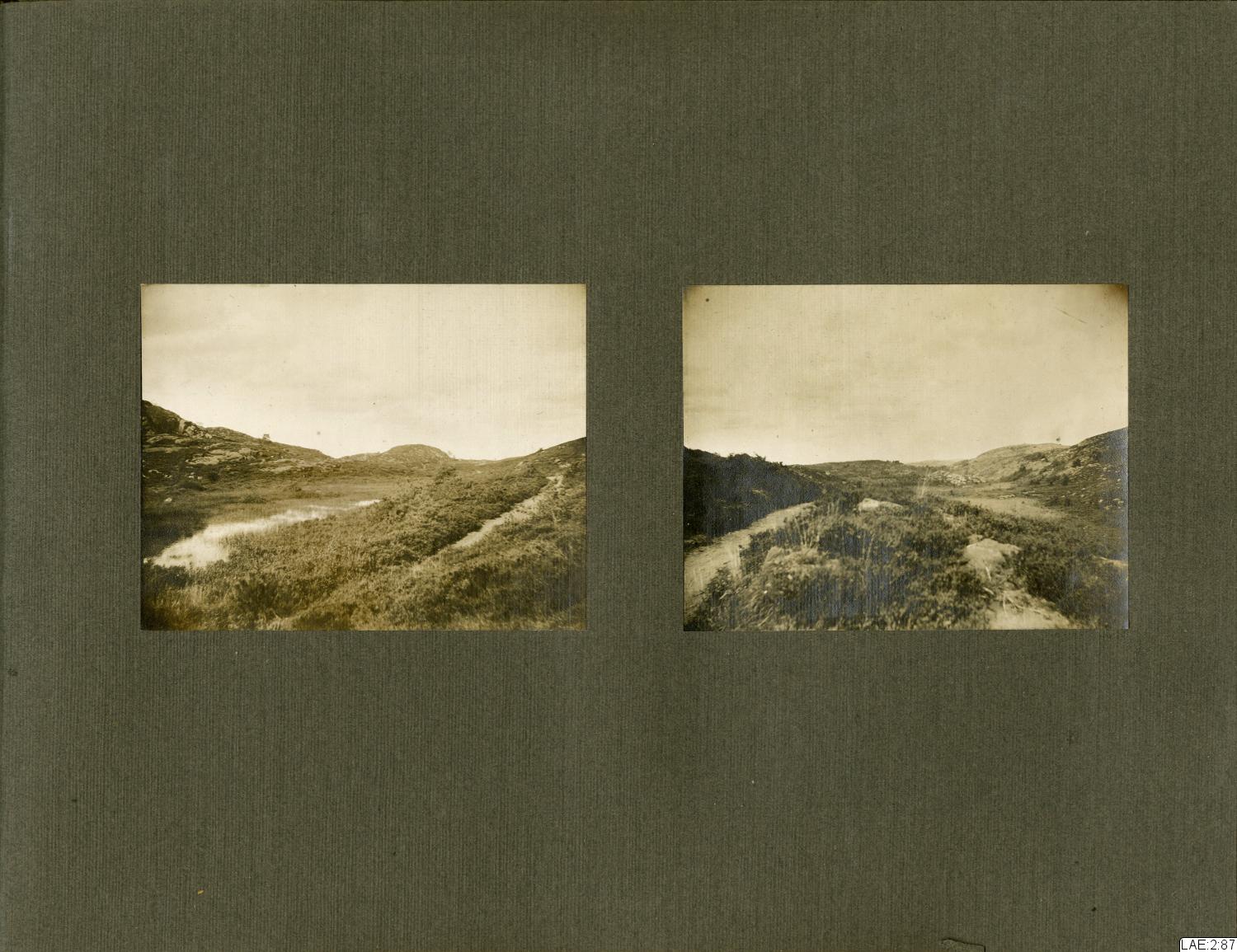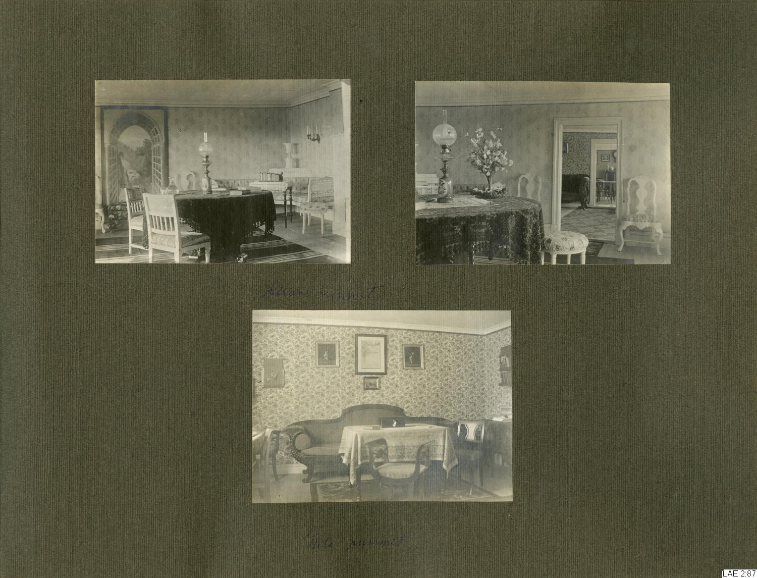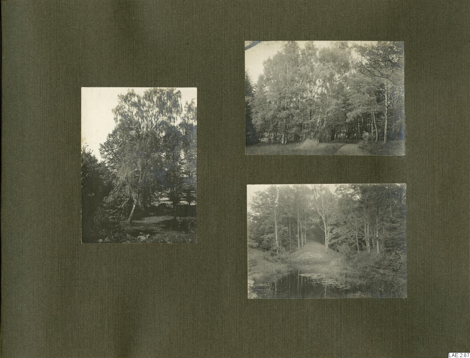 - Fotoalbum med skinnklädda, svarta pärmar, marmorerade speglar, och sidor i tjockare papper/tunn kartong med förgyllt snitt. De flesta av albumets sidor har pålimmade fotografier på ena sidan.