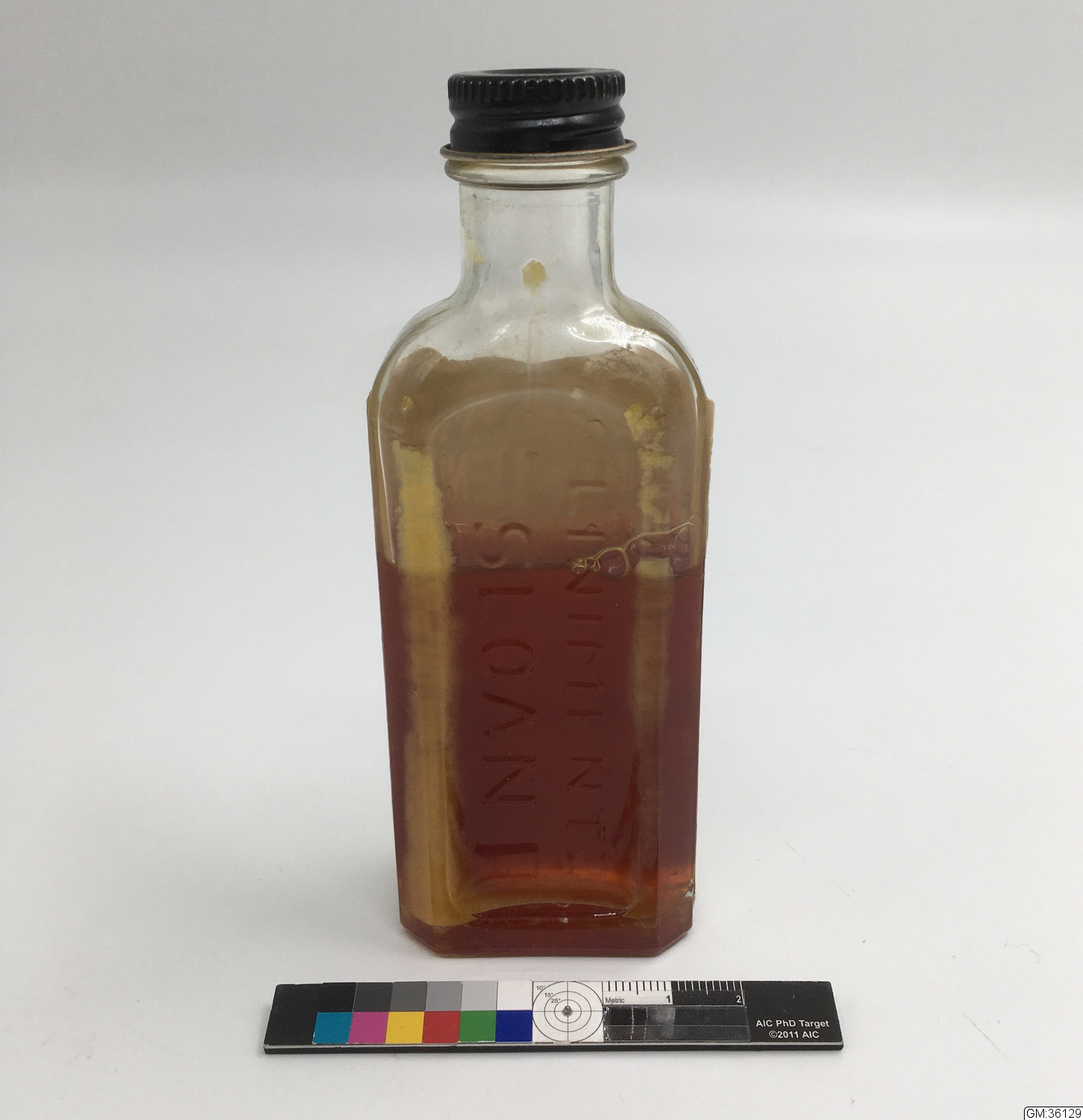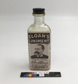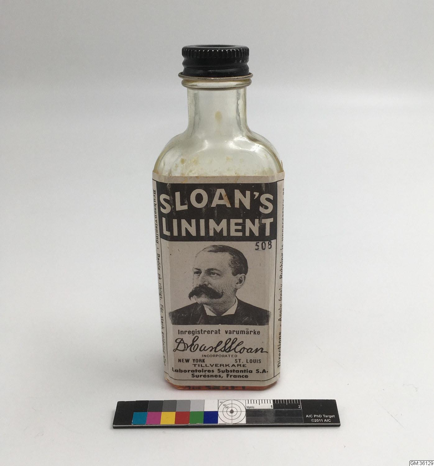 - Rektangulär platt glasflaska med ingjuten text: Liniment Sloan. Vit etikett med tryckt text: Sloans liniment. Dr. Carl Sloan. Incorporated New York St. Louis. Tillverkare Laboratories Substantia S.A. Suresnes, France. Bruksanvisning på svenska och engelska. Innehållsdeklaration. Gulbrunt, grumligt flytande innehåll. Svartmålad metallskruv.