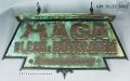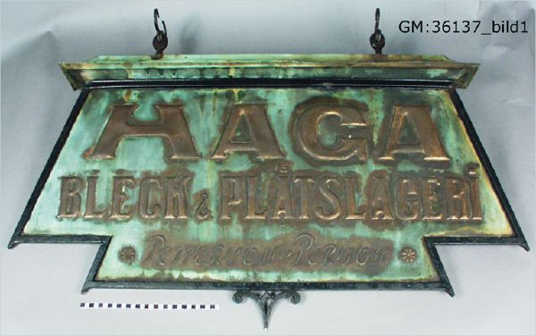 2/ Kopparskylt, grönärgad, med ram av järn. Brutet tak av koppar. Text i mässingsbokstäver på två sidor: Haga Bleck & Plåtslageri. Pettersson o Persson.