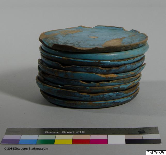 Nio tallrikar svarvade i trä och blåmålade. Med stor sannolikhet från det lilla museum över tidigare barnhem i Göteborg som fanns på Vidkärrs barnhem