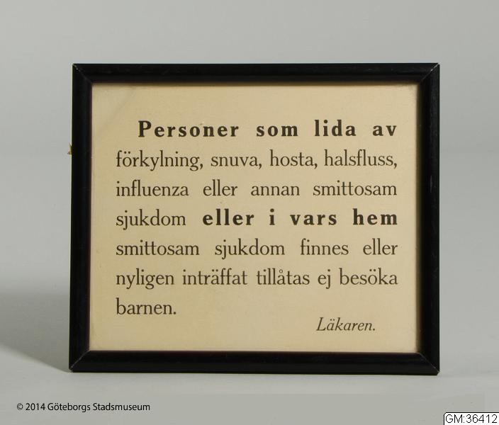 Liten inglasad tavla med svart ram med papperstryck med text om förhållningsregler gällande besökare till sjukavdelningen. Texten lyder: "Personer som lida av förkylning, snuva, hosta, halsfluss, influenza eller annan smittosam sjukdom eller i vars hem smittosam sjukdom finnes eller nyligen inträffat tillåtas ej besöka barnen. Läkaren" Baksidan har en brun skyddspapp. Upphängning med koppartråd på baksidan.