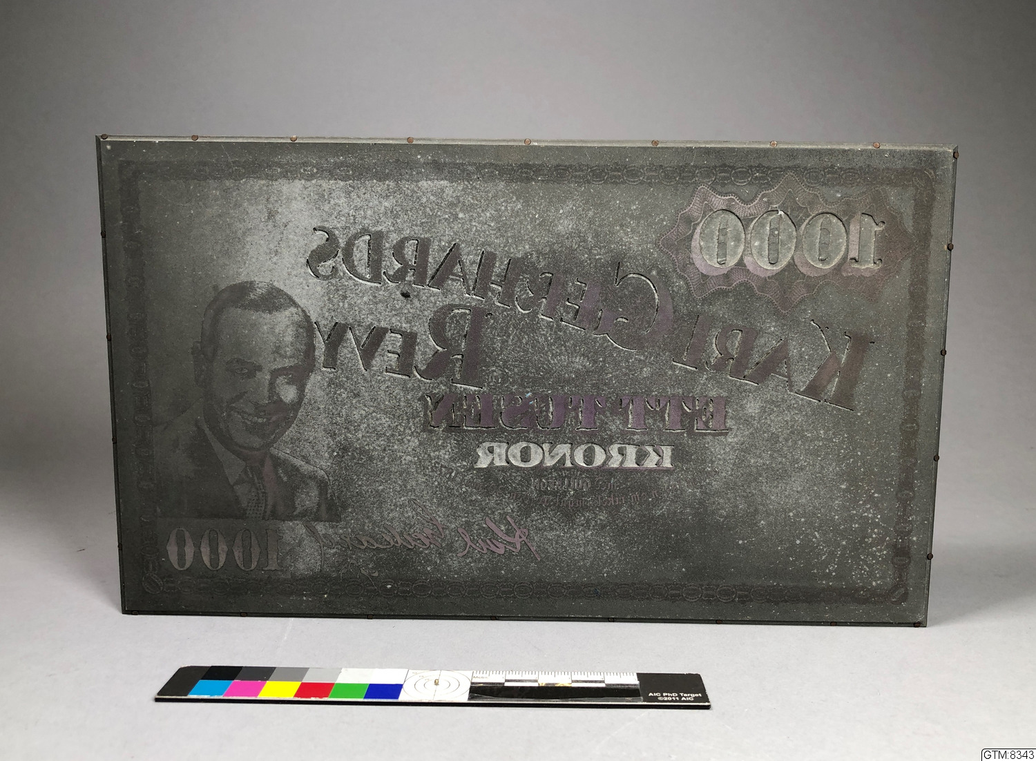 Tryckplåt i trä och metall med motiv Karl Gerhards Revy Ett tusen kronor 1000.