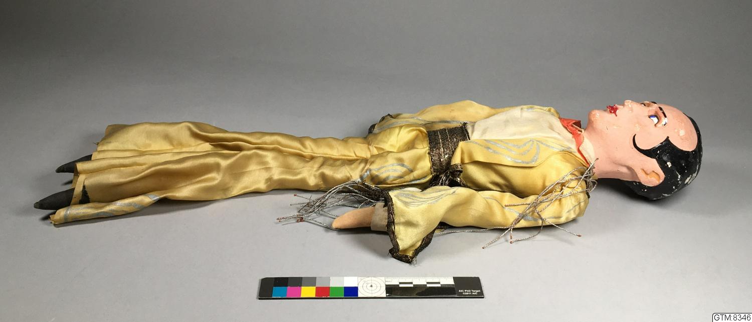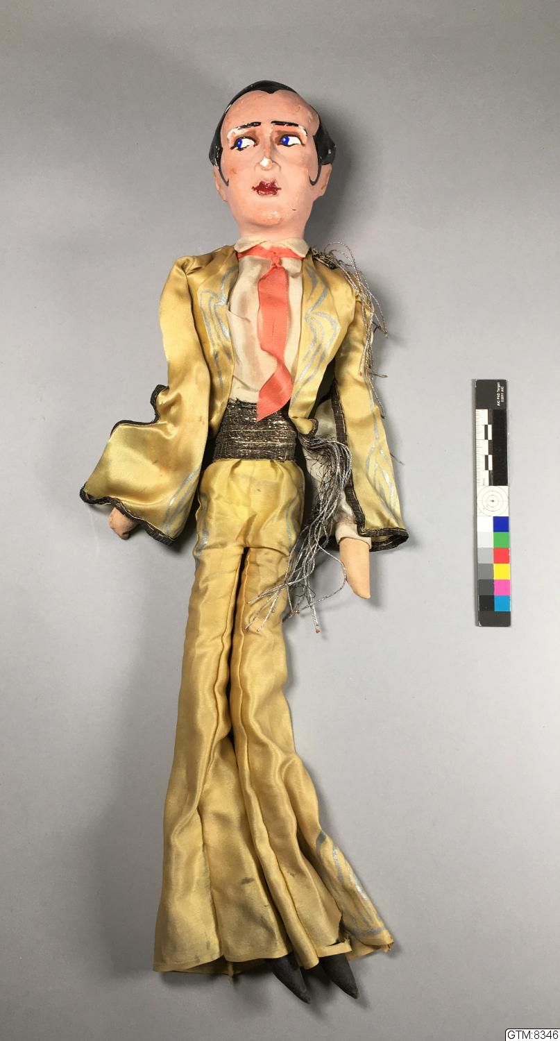 - Dockan föreställer Gösta Ekman i rollen som Danilo i föreställningen "Den glada änkan". Dockan bär en gul sidenkostym med silvriga detaljer målade på ärmar, kavajslag och längsmed benen. Gördeln utgörs av fastsydda silvriga trådar. Runt halsen bärs en röd scarf.
