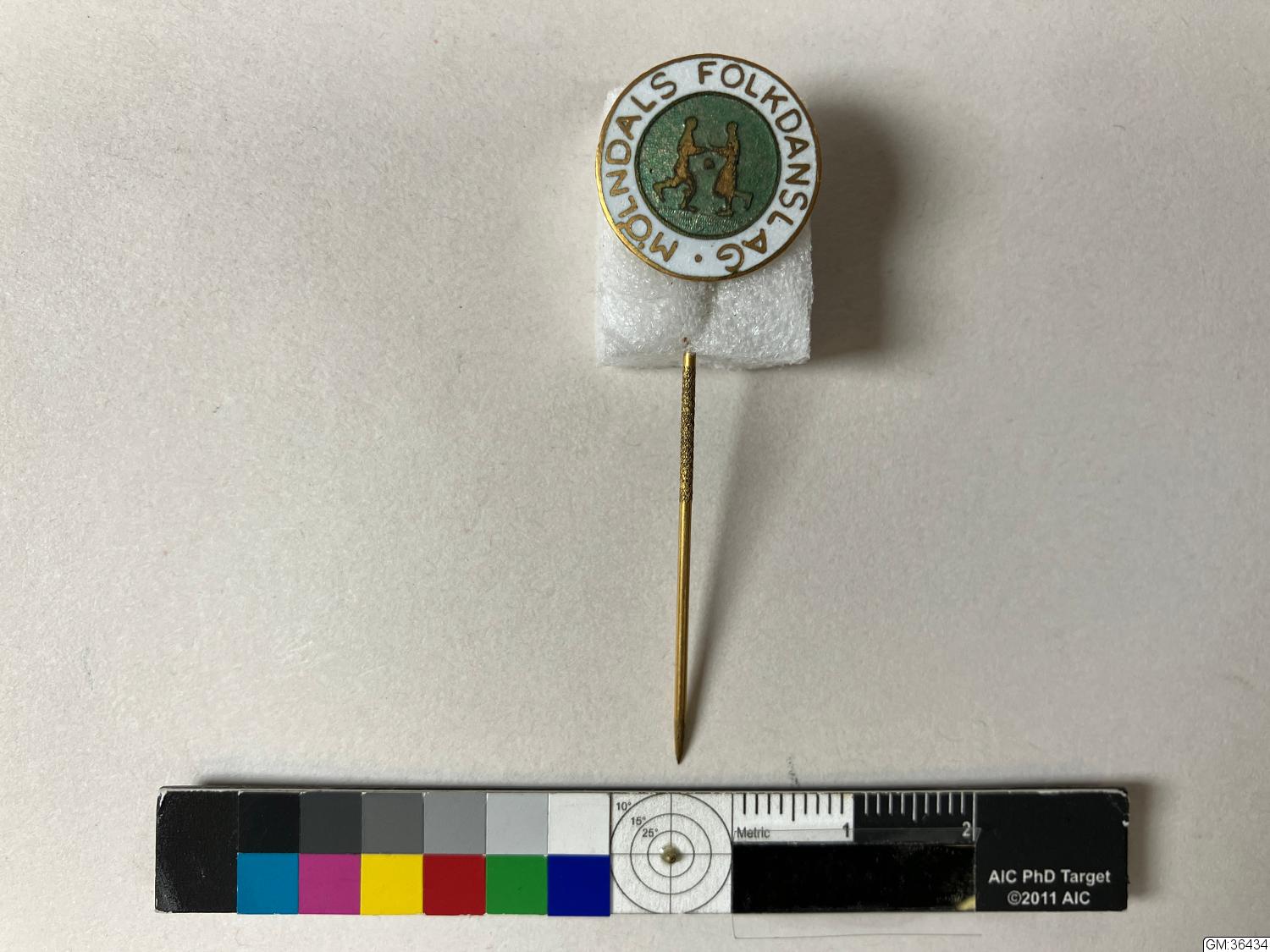 rocknål emaljerad metall dansande par på grön bakgrund vit rand runtom med texten "MÖLNDALS FOLKDANSLAG"