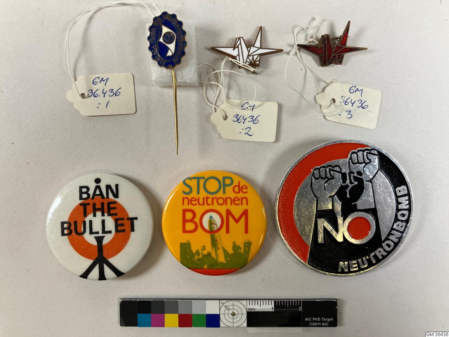 sex olika rockärken och pins knutna till "Svenska freds och skiljedomsföreningen" några märken kommer från utländska fredsrörelser.