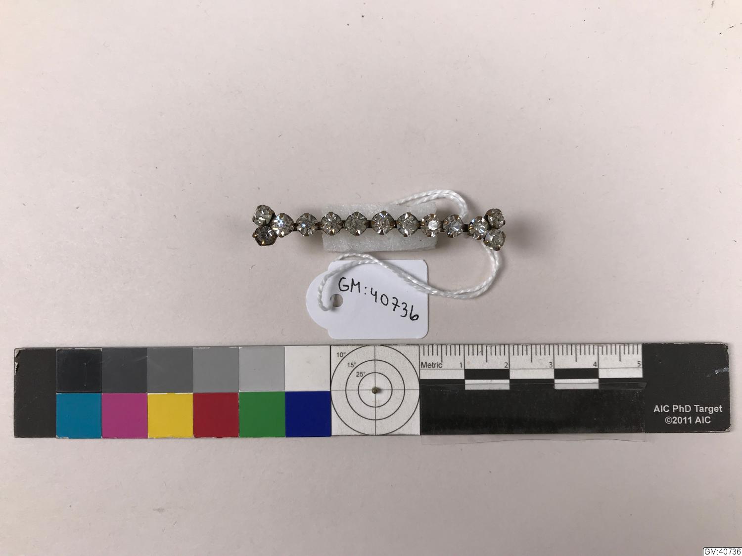 Brosch av gulmetall och nio strass-stenar på rad och dessutom ytterligare två i var ände.