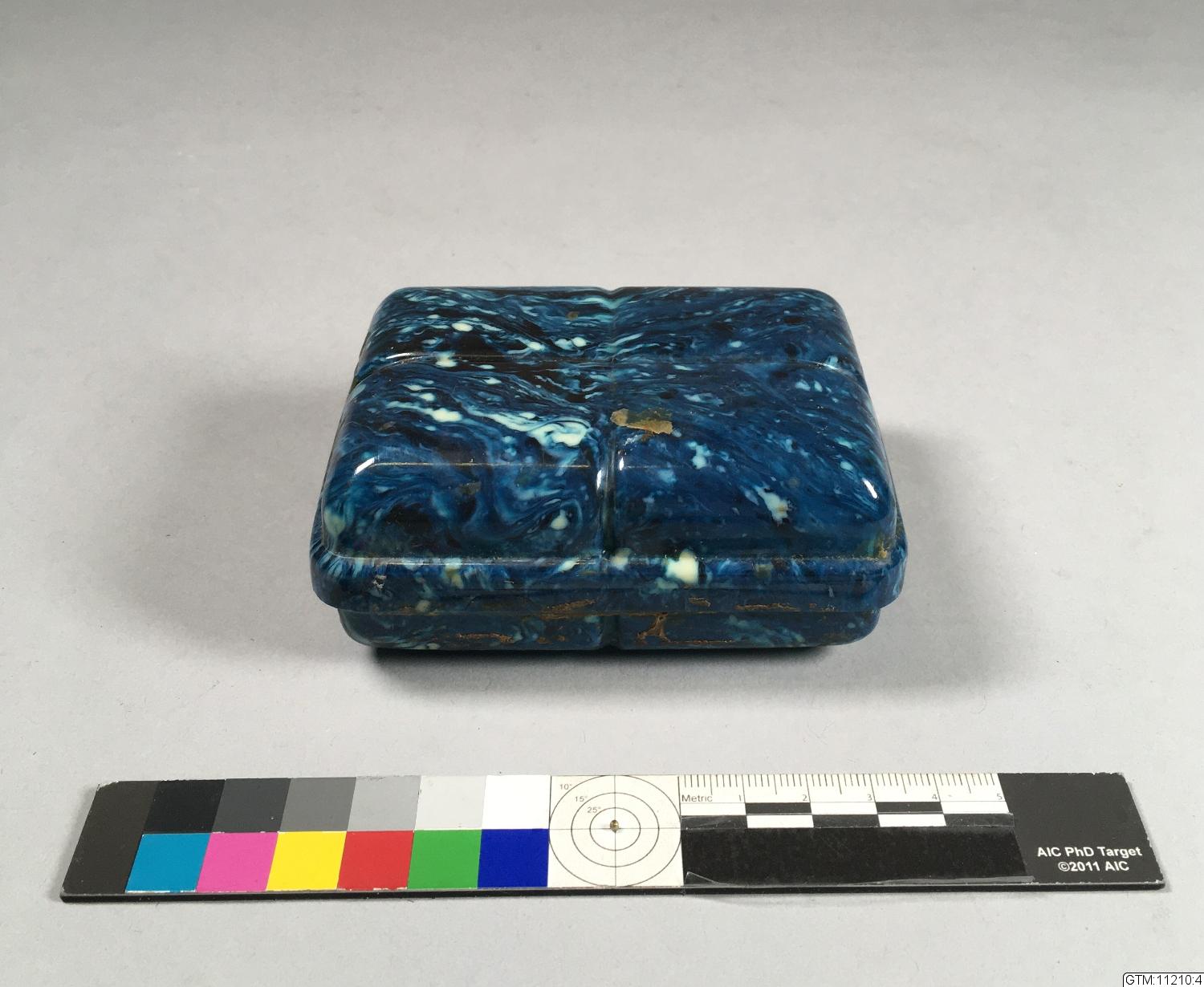 blå plastask med lock med marmorerat uttryck. Utan innehåll.