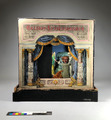 - Delar av scenografi kopplat till ett teaterverk. Figurer i papp med tryckt motiv. Bakgrund i glas med limmad dekor på. Många motiv på figurer kopplade till död, skelett, trolleri etc. Scengolvet är lådan samt med tillhörande kulisser som ingår.